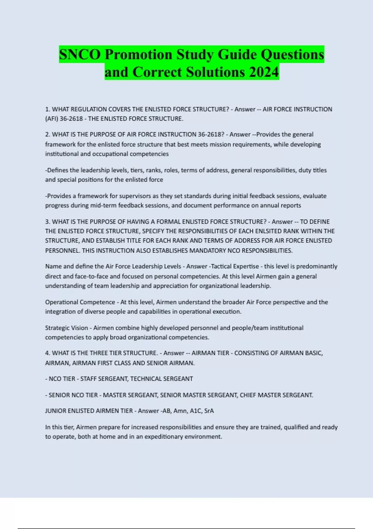 SNCO Promotion Study Guide Questions and Correct Solutions 2024 1. WHAT REGULATION COVERS THE ENLISTED FORCE STRUCTURE? - Answer -- AIR FORCE INSTRUCTION (AFI) 36-2618 - THE ENLISTED FORCE STRUCTURE. 2. WHAT IS THE PURPOSE OF AIR FORCE INSTRUCTION 36-2618? - Answer --Provides the general framework for the enlisted force structure that best meets mission requirements, while developing institutional and occupational competencies -Defines the leadership levels, tiers, ranks, roles, terms of address, general responsibilities, duty titles and special positions for the enlisted force -Provides a framework for supervisors as they set standards during initial feedback sessions, evaluate progress during mid-term feedback sessions, and document performance on annual reports 3. WHAT IS THE PURPOSE OF HAVING A FORMAL ENLISTED FORCE STRUCTURE? - Answer -- TO DEFINE THE ENLISTED FORCE STRUCTURE, SPECIFY THE RESPONSIBILITIES OF EACH ENLSITED RANK WITHIN THE STRUCTURE, AND ESTABLISH TITLE FOR EACH RANK AND TERMS OF ADDRESS FOR AIR FORCE ENLISTED PERSONNEL. THIS INSTRUCTION ALSO ESTABLISHES MANDATORY NCO RESPONSIBILITIES. Name and define the Air Force Leadership Levels - Answer -Tactical Expertise - this level is predominantly direct and face-to-face and focused on personal competencies. At this level Airmen gain a general understanding of team leadership and appreciation for organizational leadership. Operational Competence - At this level, Airmen understand the broader Air Force perspective and the integration of diverse people and capabilities in operational execution. Strategic Vision - Airmen combine highly developed personnel and people/team institutional competencies to apply broad organizational competencies. 4. WHAT IS THE THREE TIER STRUCTURE. - Answer -- AIRMAN TIER - CONSISTING OF AIRMAN BASIC, AIRMAN, AIRMAN FIRST CLASS AND SENIOR AIRMAN. - NCO TIER - STAFF SERGEANT, TECHNICAL SERGEANT - SENIOR NCO TIER - MASTER SERGEANT, SENIOR MASTER SERGEANT, CHIEF MASTER SERGEAN