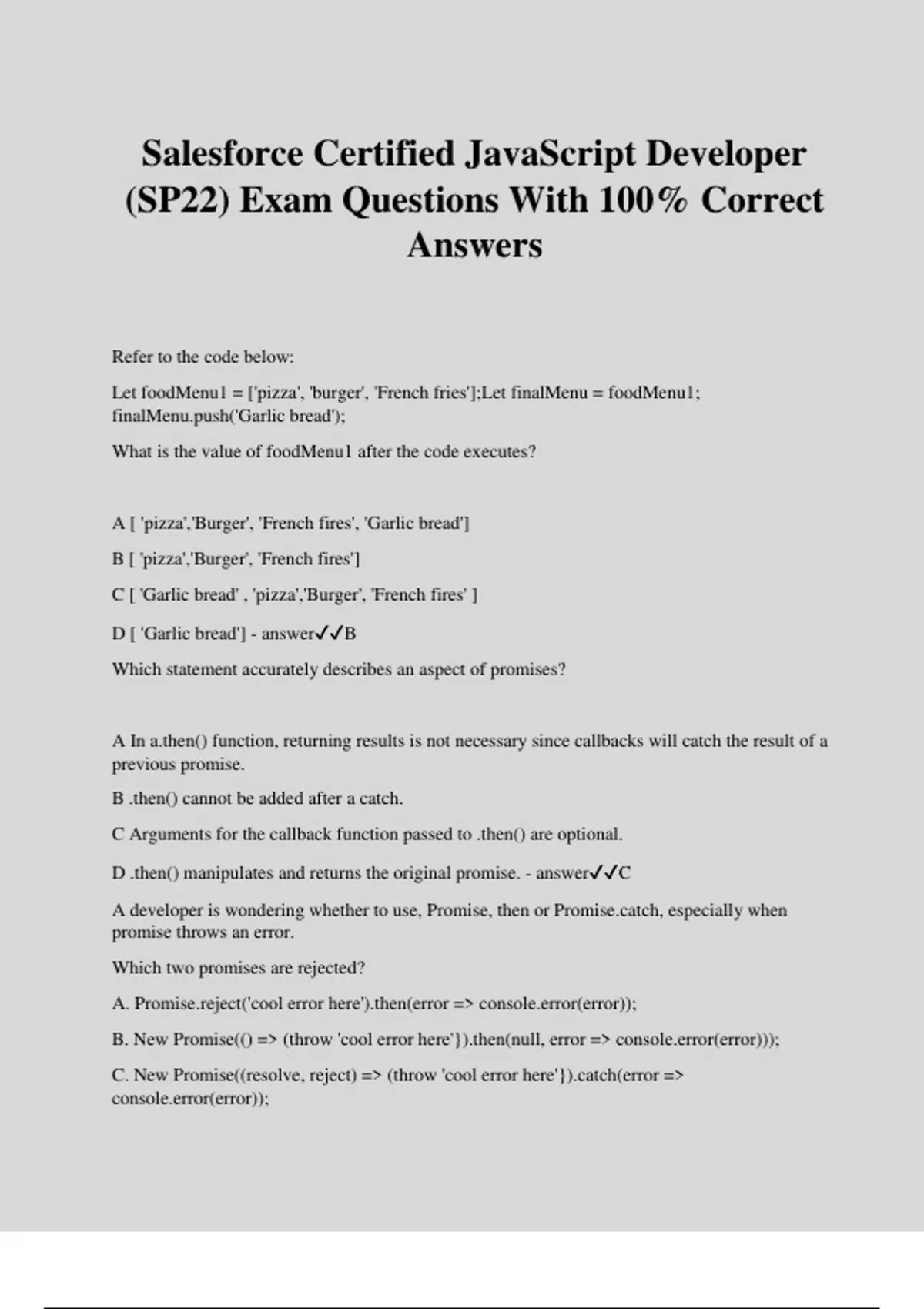 Salesforce Certified JavaScript Developer (SP22) Exam Questions With 100% Correct Answers Refer to the code below: Let foodMenu1 = ['pizza', 'burger', 'French fries'];Let finalMenu = foodMenu1; finalM('Garlic bread'); What is the value of foodMenu1 after the code executes? A [ 'pizza','Burger', 'French fires', 'Garlic bread'] B [ 'pizza','Burger', 'French fires'] C [ 'Garlic bread' , 'pizza','Burger', 'French fires' ] D [ 'Garlic bread'] - answerB Which statement accurately describes an aspect of promises? A In () function, returning results is not necessary since callbacks will catch the result of a previous promise. B .then() cannot be added after a catch. C Arguments for the callback function passed to .then() are optional. D .then() manipulates and returns the original promise. - answerC A developer is wondering whether to use, Promise, then or P, especially when promise throws an error. Which two promises are rejected? A. Pt('cool error here').then(error => (error)); B. New Promise(() => (throw 'cool error here'}).then(null, error => (error))); C. New Promise((resolve, reject) => (throw 'cool error here'}).catch(error => (error));