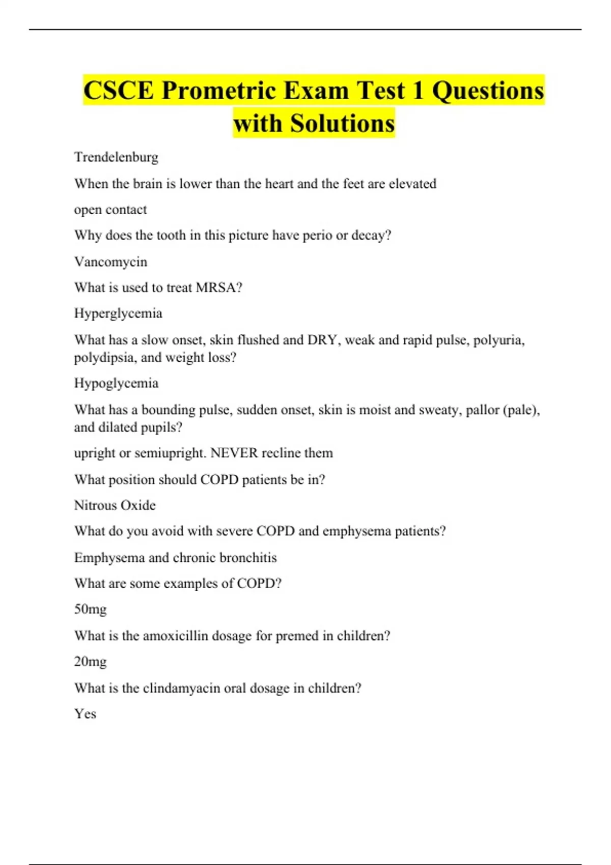 Trendelenburg When the brain is lower than the heart and the feet are elevated open contact Why does the tooth in this picture have perio or decay? Vancomycin What is used to treat MRSA? Hyperglycemia What has a slow onset, skin flushed and DRY, weak and rapid pulse, polyuria, polydipsia, and weight loss? Hypoglycemia What has a bounding pulse, sudden onset, skin is moist and sweaty, pallor (pale), and dilated pupils? upright or semiupright. NEVER recline them What position should COPD patients be in? Nitrous Oxide What do you avoid with severe COPD and emphysema patients? Emphysema and chronic bronchitis What are some examples of COPD? 50mg What is the amoxicillin dosage for premed in children? 20mg What is the clindamyacin oral dosage in children? Yes Do patients take premed for prosthetic heart valves? Yes Do patients take premed if they have had previous endocarditis or infective endocarditis? Endocarditis What is the inflammation of the inner tissues, the endocardium, usually of the valves? It is caused by infectious agents or pathogens, which are largely bacterial. Yes Do you premed patients with cardiac transplant recipients with prosthetic valves? 11/12 Which Gracey would be used to scale the mesial surface of a distal molar? 13/14 Which Gracey would be used to scale the distal surface of the mesial root? Permanent premolars What teeth replace deciduous molars? decrease vertical angulation How do you correct an x-ray that has been foreshortened? increase vertical angulation How do you correct elongation in an x-ray? Elongation decreased vertical angulation (under-angulation) Foreshortening increased vertical angulation (over-angulation) 2 minutes How long do you wash your hands before the start of the day? 15 seconds How long do you wash your hands in between patients? Cholorohexidine What is a good preprocedular rinse? tongue scraper What is not useful for a patient with xerostomia? pilocarpine What acts to increase salivary output? Aspirin burn A patient has leukoplakia on his/her muccobuccal fold and is complaining of a toothache. What is this? Leukoplakia What is a white patch of plaque that cannot be characterized clinically or pathologically as any other disease? Fordyce granules What are the clusters on the buccal mucosa? Fibroma What is a smooth surface lesion of fibrous tissue (it resembles a ball under mucosa)? Amelogenisis imperfecta Flurosis Amelogeneis imperfecta Super thin enamel, broken to the gum line. hereditary. The teeth are yellow, brown, or gray