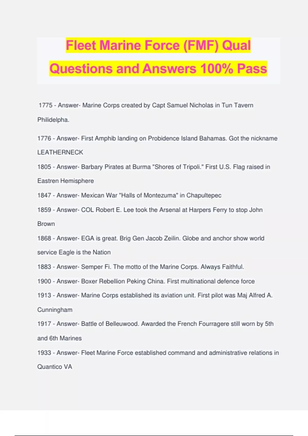Fleet Marine Force (FMF) Qual Questions and Answers 100% Pass 1775 - Answer- Marine Corps created by Capt Samuel Nicholas in Tun Tavern Philidelpha. 1776 - Answer- First Amphib landing on Probidence Island Bahamas. Got the nickname LEATHERNECK 1805 - Answer- Barbary Pirates at Burma "Shores of Tripoli." First U.S. Flag raised in Eastren Hemisphere 1847 - Answer- Mexican War "Halls of Montezuma" in Chapultepec 1859 - Answer- COL Robert E. Lee took the Arsenal at Harpers Ferry to stop John Brown 1868 - Answer- EGA is great. Brig Gen Jacob Zeilin. Globe and anchor show world service Eagle is the Nation 1883 - Answer- Semper Fi. The motto of the Marine Corps. Always Faithful. 1900 - Answer- Boxer Rebellion Peking China. First multinational defence force 1913 - Answer- Marine Corps established its aviation unit. First pilot was Maj Alfred A. Cunningham 1917 - Answer- Battle of Belleuwood. Awarded the French Fourragere still worn by 5th and 6th Marines 1933 - Answer- Fleet Marine Force established command and administrative relations in Quantico VA 1965 - Answer- Marines landed in South Vietnam for longest war in history, also in the Dominican Republic 1982 - Answer- Lebonon Oct 23 198 Bomb hit HQ killed 241 wounded 70 Americans 1991 - Answer- Desert Storm Jan 1991 Marine ground forces liberated Kuwait 2001 - Answer- Sep 11. Marines sent to Afgan Nov 25th started Operation Swift Freedom 2003 - Answer- Operation Iraqi Freedom 2004A - Answer- Retaking of Fallujah Operation Vigilant Resolve 2004B - Answer- Operation Phantom Fury and Operation The Dawn in Iraq Battle of Guadalcanal - Answer- Aug 7 1942 Solomon Islands first attempt of Amphibous Doctrine Battle of Belluwood - Answer- France WW1 Germans rated Marines as "Storm Troopers" Higest rating also Devil Dogs Battle of Tarawa - Answer- Gilbert Islands "It will take 1 million Americans 100 years to concure it" It took 76 hours Battle of Mariana Islands - Answer- Saipan Guam and Tinian Largest number of troops under Marine Command Battle of Iwo Jima - Answer- Largest Bloodiest battle in Maine history 23300 casualties "uncommon Valor wsa a common Virtue" Battle of Chosin Reservoir - Answer- North Korea 1950 10 Chinese Divisions, 7 stopped evaced dead used all operable equipment and maintained tactical intergrity Battle of Hue City - Answer- Vietnamese Holiday Tet Jan 1968 Fighting was House to House progress messured in yards Archibald Henderson - Answer- Commandant for 39 Years known as the "Grand old man of the Marine Corps" Sergeant Major John Quick - Answer- Got a Medal of Honor for an emergency lift of Naval Bombardment while under Spanish and American Shell Fire 1898. Sergent Major Dan Daly - Answer- 2 Medals of Honor 1st Boxer Rebellion 2nd Caco War in Haiti "Come on you sons of bitches do you want to live forever?" Belleuwood. Louis B. "Chesty" Puller - Answer- Lt Gen Puller Nicaragua "Tiger of the Mountians" Chesty the Bulldog named after him. Gregory R. "Pappy" Boyington - Answer- Maj Boyington Aerial Ace VMH-214 "Black Sheep" Top Flying Ace 28 kills Ira H. Hayes - Answer- Pima Indian. Did the Second Flag Raising on Mount Suribachi Iwo Jima 23Feb1945 Opha Mae Johnson - Answer- First Enlisted Marine Female 13AUG1918 Margaret A. Brewer - Answer- Brig Gen Brewer Director of Female Marines first General Officer Female Robert E. Bush - Answer- Medal of Honor Battle of Okinawa WW2 John H."Jack" Bradley - Answer- 1 of 6 to raise flag in Iwo Jima Earned Navy Cross for lafe saving aid to Marine Robert R. Ingram - Answer- Medal of Honor in Vietnam gave