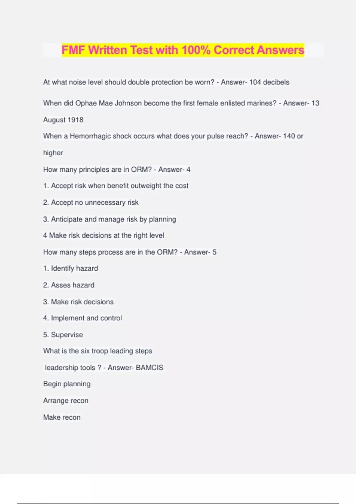 FMF Written Test with 100% Correct Answers At what noise level should double protection be worn? - Answer- 104 decibels When did Ophae Mae Johnson become the first female enlisted marines? - Answer- 13 August 1918 When a Hemorrhagic shock occurs what does your pulse reach? - Answer- 140 or higher How many principles are in ORM? - Answer- 4 1. Accept risk when benefit outweight the cost 2. Accept no unnecessary risk 3. Anticipate and manage risk by planning 4 Make risk decisions at the right level How many steps process are in the ORM? - Answer- 5 1. Identify hazard 2. Asses hazard 3. Make risk decisions 4. Implement and control 5. Supervise What is the six troop leading steps leadership tools ? - Answer- BAMCIS Begin planning Arrange recon Make recon Complete the plan Issue the order Supervise What are compose of Service chain of command? - Answer- 1. The President 2. Secretary of Defense 3. Secretary of the Navy 4. Commandant of Marine Corps Operational Chain of Command are compose of? - Answer- 1. The President 2. Secretary of Defense 3. Commanders of Combatant Command This is the individual or group attitude that ensures prompt obedience to orders and initiation of appropriate action in the absence of orders? - Answer- Disciplines What are the measurements of Straddle Trench ? - Answer- 4 ft long 2 1/2 ft deep 1 ft wide What are the measurements of Cat Hole? - Answer- 1 foot wide x 1 foot deep When do you use a Cat Hole? - Answer- is used when on the march When do you use Straddle Trench? - Answer- is used for 1 to 3 day bivouac sites What is an unauthorized disclosure of classified information to one or more persons who do not possess a current valid security clearance? - Answer- compromise How many methods are there to tie down an antenna? - Answer- 4 1. Stay-down clamp 2. Snap-free clamp 3. Stay-down clip 4. Snap-free clip The efforts of an individual used against another to cause death, substantial risk of death, or serious bodily harm? - Answer- Deadly Force The six conditions that justify the use of Deadly Force? - Answer- 1. Defend yourself 2. Defend property not involving national security 3. Defend property not involving national security but inherently dangerous to others 4. Prevent crimes against people 5. Apprehend individual 6. Establish and or maintain lawful order What is also known as the "hold up" battery ? - Answer- BA 5372 When searching field of view using the off center vision method and what degrees do you look? - Answer- 6-10 degrees What is the weight of the M2 50 Caliber Machine gun? - Answer- 128 pounds What is the weight of M249 with bipod and tools? - Answer- 17 pounds What is the maximum range of the M16A4? - Answer- 3,600 meters What is the maximum effective range of the M16A4? - Answer- 550m point target 800m area target What is the caliber of the M16A4? - Answer- 5.56 millimeters What condition does not apply to the M9? - Answer- condition 2 What is the maximum effective range of an M9? - Answer- 50 meters When you pre GREQ what appears? - Answer- 00000 When was the Chinese boxer rebellion? - Answer- 1900