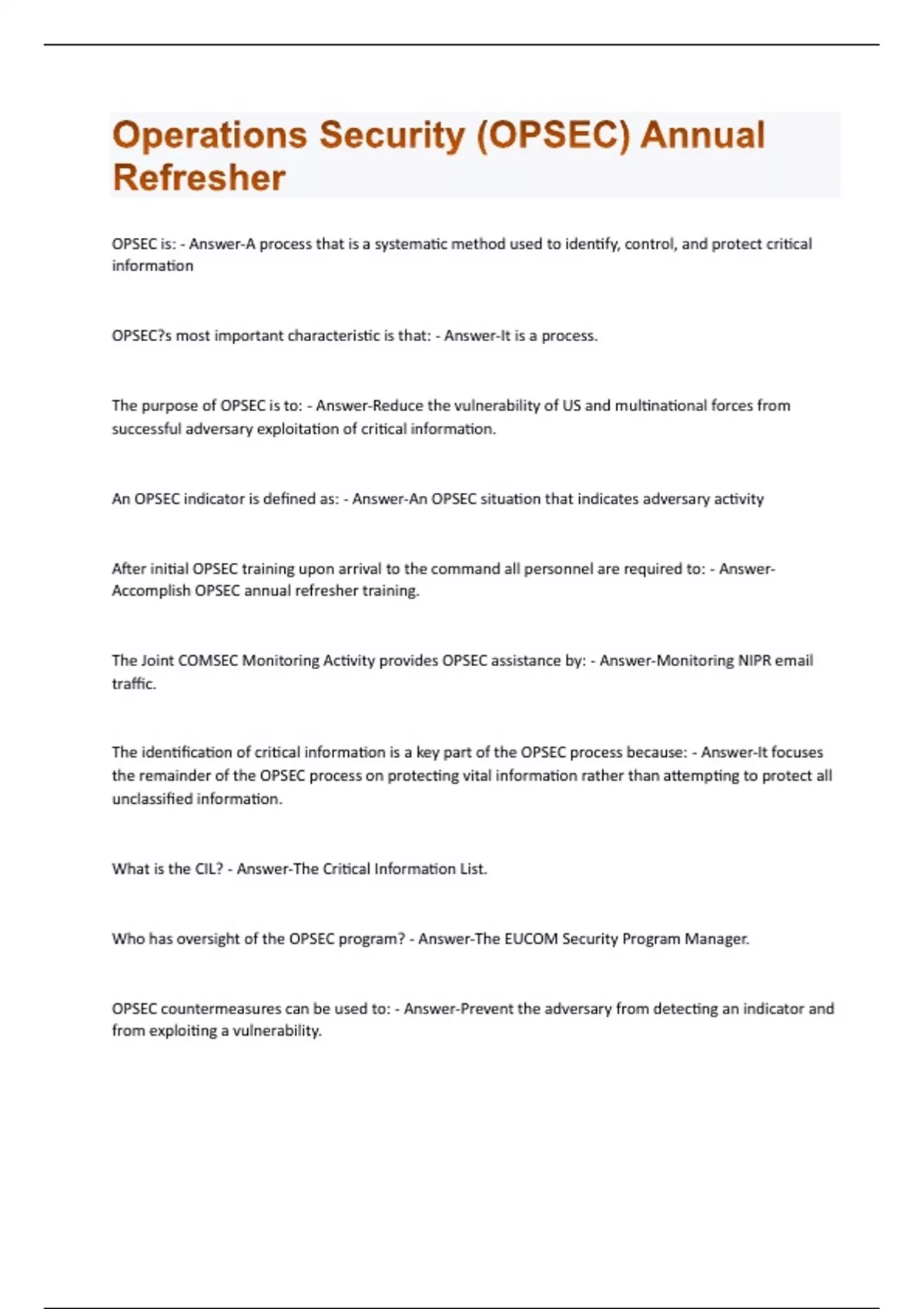 OPSEC is: - Answer-A process that is a systematic method used to identify, control, and protect critical information OPSEC?s most important characteristic is that: - Answer-It is a process. The purpose of OPSEC is to: - Answer-Reduce the vulnerability of US and multinational forces from successful adversary exploitation of critical information. An OPSEC indicator is defined as: - Answer-An OPSEC situation that indicates adversary activity After initial OPSEC training upon arrival to the command all personnel are required to: - AnswerAccomplish OPSEC annual refresher training. The Joint COMSEC Monitoring Activity provides OPSEC assistance by: - Answer-Monitoring NIPR email traffic. The identification of critical information is a key part of the OPSEC process because: - Answer-It focuses the remainder of the OPSEC process on protecting vital information rather than attempting to protect all unclassified information. What is the CIL? - Answer-The Critical Information List. Who has oversight of the OPSEC program? - Answer-The EUCOM Security Program Manager. OPSEC countermeasures can be used to: - Answer-Prevent the adversary from detecting an indicator and from exploiting a vulnerability.OPSEC is concerned with: - Answer-Identifying, controlling, and protecting unclassified information that is associated with specific military operations and activities. Operations Security (OPSEC) defines Critical Information as: - Answer-Specific facts about friendly intentions, capabilities, and activities needed by adversaries to plan and act effectively against friendly mission accomplishment. OPSEC as a capability of Information Operations - Answer-OPSEC as a capability of Information Operations A vulnerability exists when: - Answer-The adversary is capable of collecting critical information, correctly analyzing it, and then taking timely action. Where is the CIL located? - Answer-On the EUCOM NIPR and SIPR homepages and accessed via the OPSEC ICON. All EUCOM personnel must know the difference between: - Answer-OPSEC and traditional security programs. What action should a member take if it is believed that an OPSEC disclosure has occurred? - AnswerReport the OPSEC disclosure to your OPSEC representative or the EUCOM OPSEC PM. Understanding that protection of sensitive unclassified information is: - Answer-The responsibility of all persons, including civilians and contractors