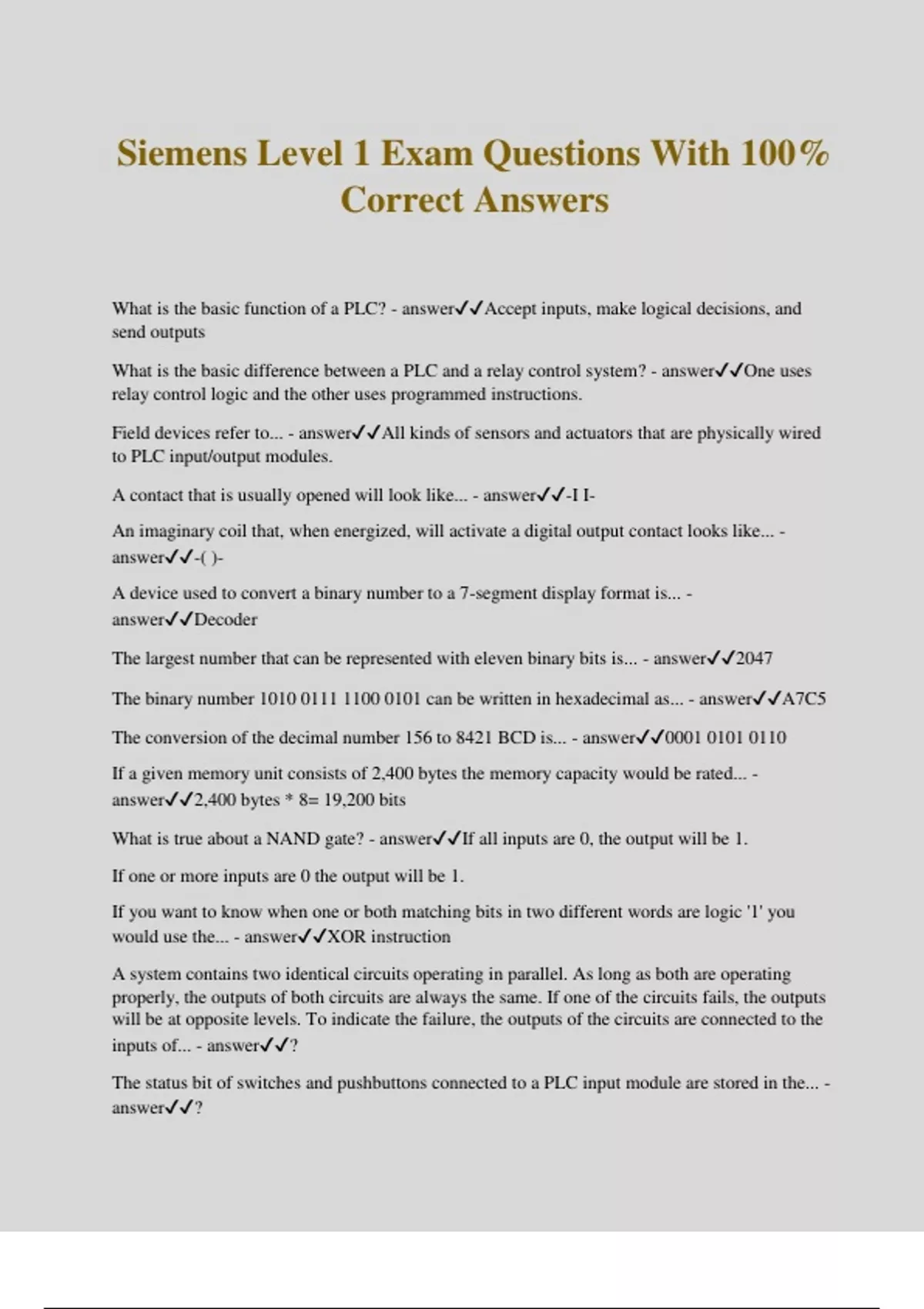 Siemens Level 1 Exam Questions With 100% Correct Answers What is the basic function of a PLC? - answerAccept inputs, make logical decisions, and send outputs What is the basic difference between a PLC and a relay control system? - answerOne uses relay control logic and the other uses programmed instructions. Field devices refer to... - answerAll kinds of sensors and actuators that are physically wired to PLC input/output modules. A contact that is usually opened will look like... - answer-I I- An imaginary coil that, when energized, will activate a digital output contact looks like... - answer-( )- A device used to convert a binary number to a 7-segment display format is... - answerDecoder The largest number that can be represented with eleven binary bits is... - answer2047 The binary number can be written in hexadecimal as... - answerA7C5 The conversion of the decimal number 156