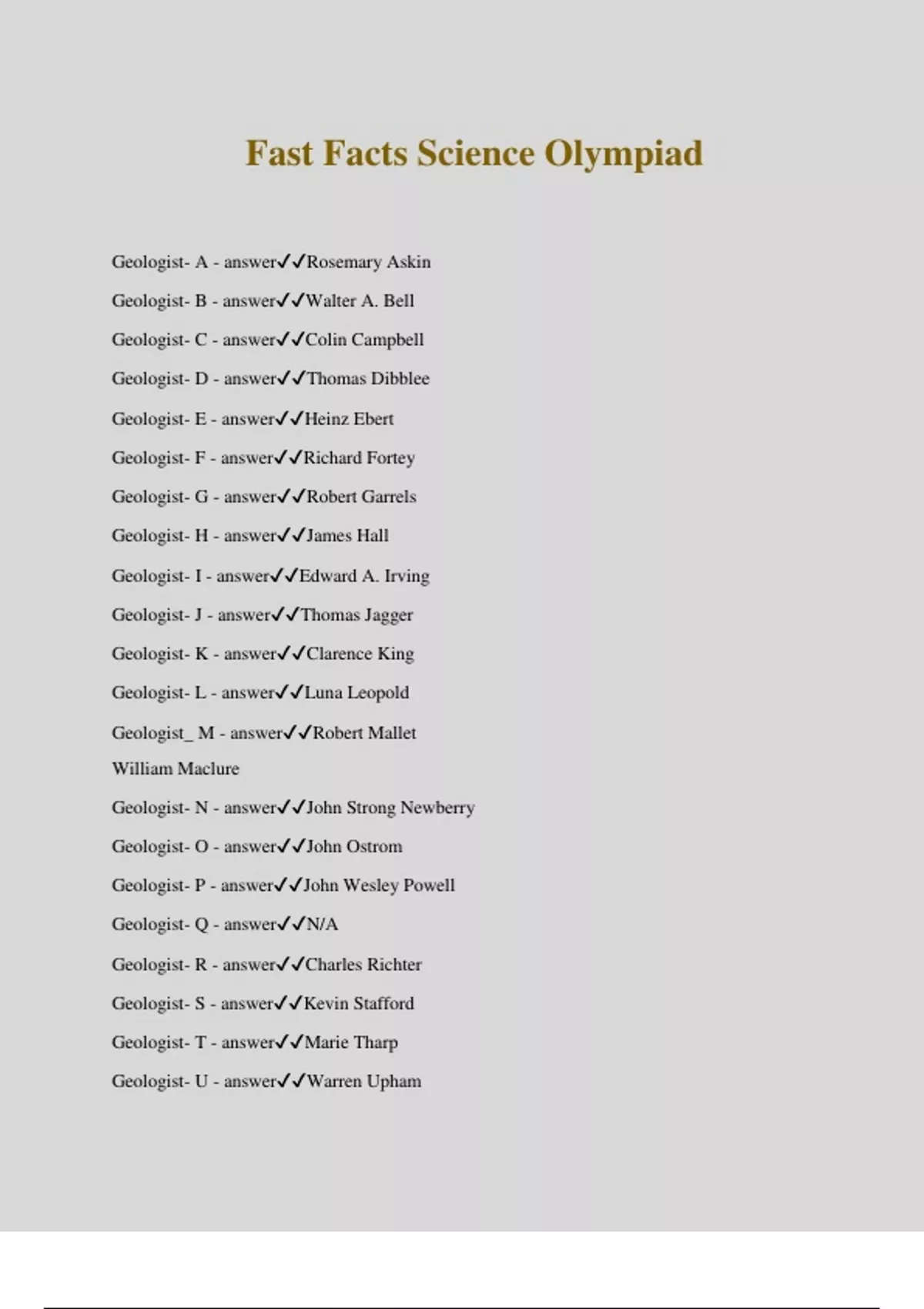 Fast Facts Science Olympiad Geologist- A - answerRosemary Askin Geologist- B - answerWalter A. Bell Geologist- C - answerColin Campbell Geologist- D - answerThomas Dibblee Geologist- E - answerHeinz Ebert Geologist- F - answerRichard Fortey Geologist- G - answerRobert Garrels Geologist- H - answerJames Hall Geologist- I - answerEdward A. Irving Geologist- J - answerThomas Jagger Geologist- K - answerClarence King Geologist- L - answerLuna Leopold Geologist_ M - answerRobert Mallet William Maclure Geologist- N - answerJohn Strong Newberry Geologist- O - answerJohn Ostrom Geologist- P - answerJohn Wesley Powell Geologist- Q - answerN/A Geologist- R - answerCharles Richter Geologist- S - answerKevin Stafford Geologist- T - answerMarie Tharp Geologist- U - answerWarren Upham