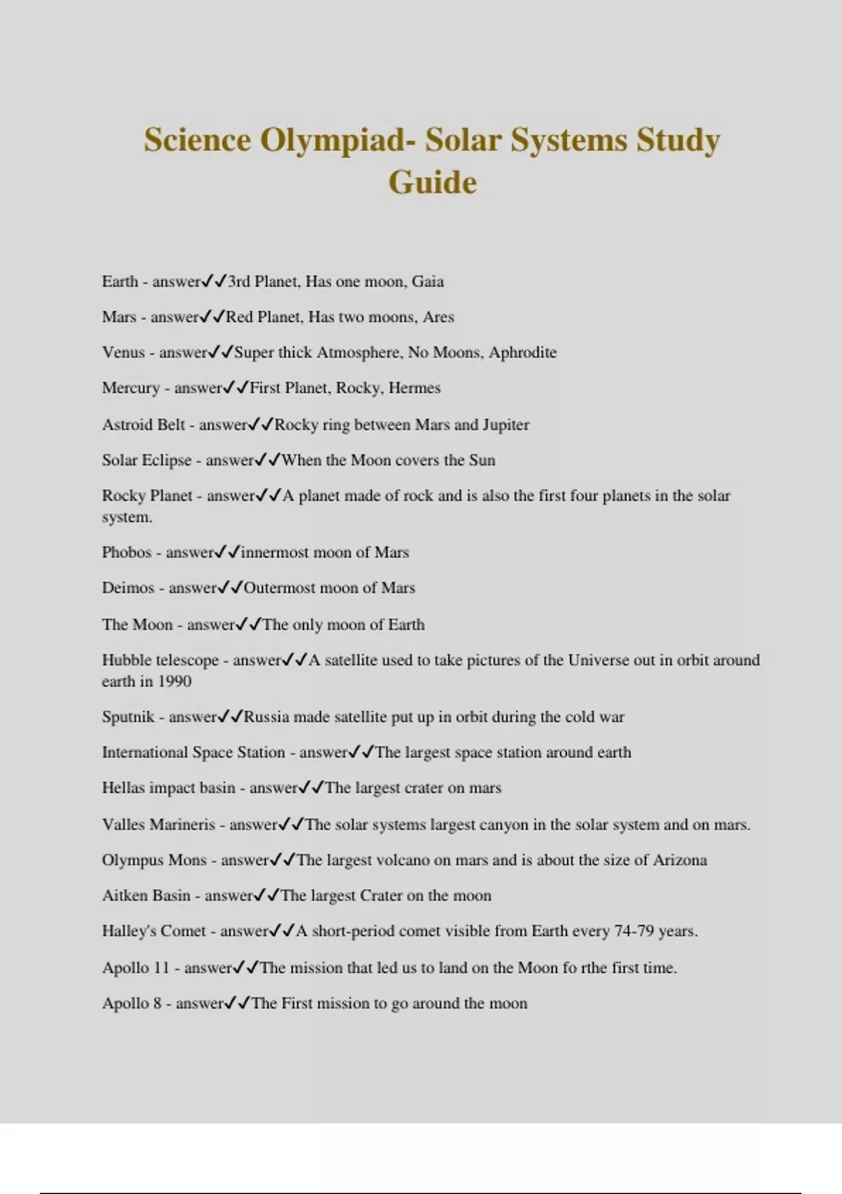 Science Olympiad- Solar Systems Study Guide Earth - answer3rd Planet, Has one moon, Gaia Mars - answerRed Planet, Has two moons, Ares Venus - answerSuper thick Atmosphere, No Moons, Aphrodite Mercury - answerFirst Planet, Rocky, Hermes Astroid Belt - answerRocky ring between Mars and Jupiter Solar Eclipse - answerWhen the Moon covers the Sun Rocky Planet - answerA planet made of rock and is also the first four planets in the solar system. Phobos - answerinnermost moon of Mars Deimos - answerOutermost moon of Mars The Moon - answerThe only moon of Earth Hubble telescope - answerA satellite used to take pictures of the Universe out in orbit around earth in 1990 Sputnik - answerRussia made satellite put up in orbit during the cold war International Space Station - answerThe largest space station around earth Hellas impact basin - answerThe largest crater on mars Valles Marineris - answerThe solar systems largest canyon in the solar system and on mars. Olympus Mons - answerThe largest volcano on mars and is about the size of Arizona Aitken Basin - answerThe largest Crater on the moon Halley's Comet - answerA short-period comet visible from Earth every 74-79 years. Apollo 11 - answerThe mission that led us to land on the Moon fo rthe first time. Apollo 8 - answerThe First mission to go around the moon