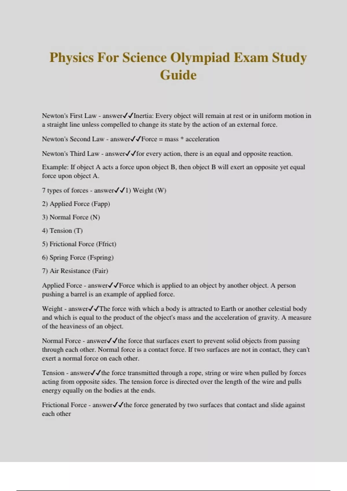 Physics For Science Olympiad Exam Study Guide Newton's First Law - answerInertia: Every object will remain at rest or in uniform motion in a straight line unless compelled to change its state by the action of an external force. Newton's Second Law - answerForce = mass * acceleration Newton's Third Law - answerfor every action, there is an equal and opposite reaction. Example: If object A acts a force upon object B, then object B will exert an opposite yet equal force upon object A. 7 types of forces - answer1) Weight (W) 2) Applied Force (Fapp) 3) Normal Force (N) 4) Tension (T) 5) Frictional Force (Ffrict) 6) Spring Force (Fspring) 7) Air Resistance (Fair) Applied Force - answerForce which is applied to an object by another object. A person pushing a barrel is an example of