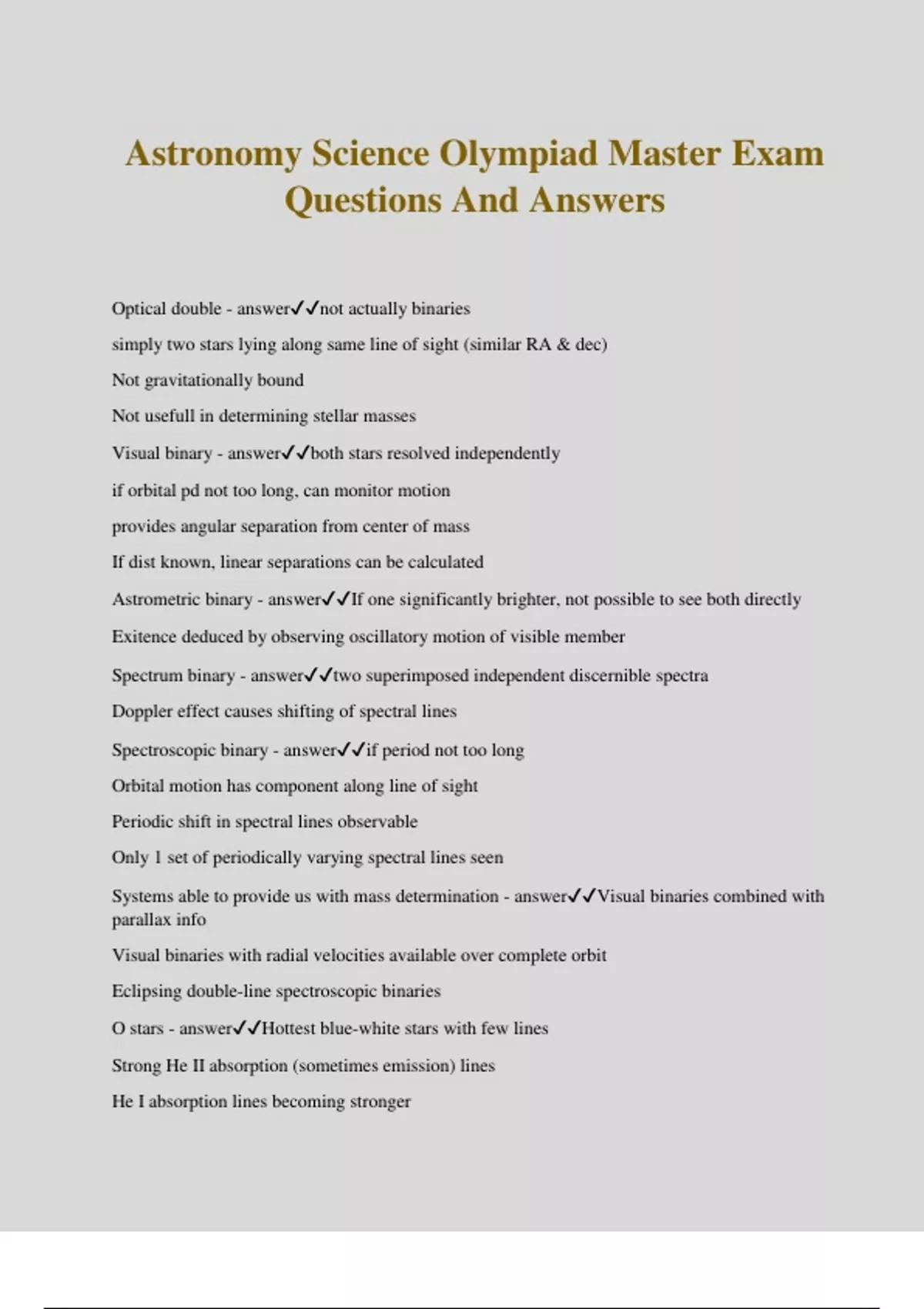 Astronomy Science Olympiad Master Exam Questions And Answers Optical double - answernot actually binaries simply two stars lying along same line of sight (similar RA & dec) Not gravitationally bound Not usefull in determining stellar masses Visual binary - answerboth stars resolved independently if orbital pd not too long, can monitor motion provides angular separation from center of mass If dist known, linear separations can be calculated Astrometric binary - answerIf one significantly brighter, not possible to see both directly Exitence deduced by observing oscillatory motion of visible member Spectrum binary - answertwo superimposed independent discernible spectra Doppler effect causes shifting of spectral lines Spectroscopic binary - answerif period not too long Orbital motion has component along line of sight Periodic shift in spectral lines observable Only 1 set of periodically varying spectral lines seen Systems able to provide us with mass determination - answerVisual binaries combined with parallax info Visual binaries with radial velocities available over complete orbit Eclipsing double-line spectroscopic binaries O stars - answerHottest blue-white stars with few lines Strong He II absorption (sometimes emission) lines He I absorption lines becoming stronger B stars - answerHot blue-white He I absorption lines strongest at B2 H I (Balmer) absorption lines getting stronger A stars - answerWhite Balmer absorption lines strongest at A), becoming weaker later Ca II absorption lines becoming stronger F stars - answerYellow-white Ca II lines continue to increase, Balmer lines decrease Neutral metal absorption lines (Fe I, Cr I) G stars - answerYellow Solar-type spectra Ca II increase Fe I, other neutral metal increase K stars - answerCool orange Ca II H & K strongest K0, then decrease dominated by metal absorption M stars - answerCool red Molecular absorption bands (TiO, VO) Neutral metal absorption lines remain strong L stars - answerVery cool, dark red Stronger in infrared Strong molecular absorption bands of metal hydrides, water, CO, Na, K, Rb, Cs, Alkalis TiO, VO decrease T stars - answerCoolest, Infrared Strong methane, CO decrease Wolf-Rayet stars - answerdiscovered by C.J.E. Wolf and G. Rayet Paris Observatory in 1867 more than 220 WR identified, most likely more