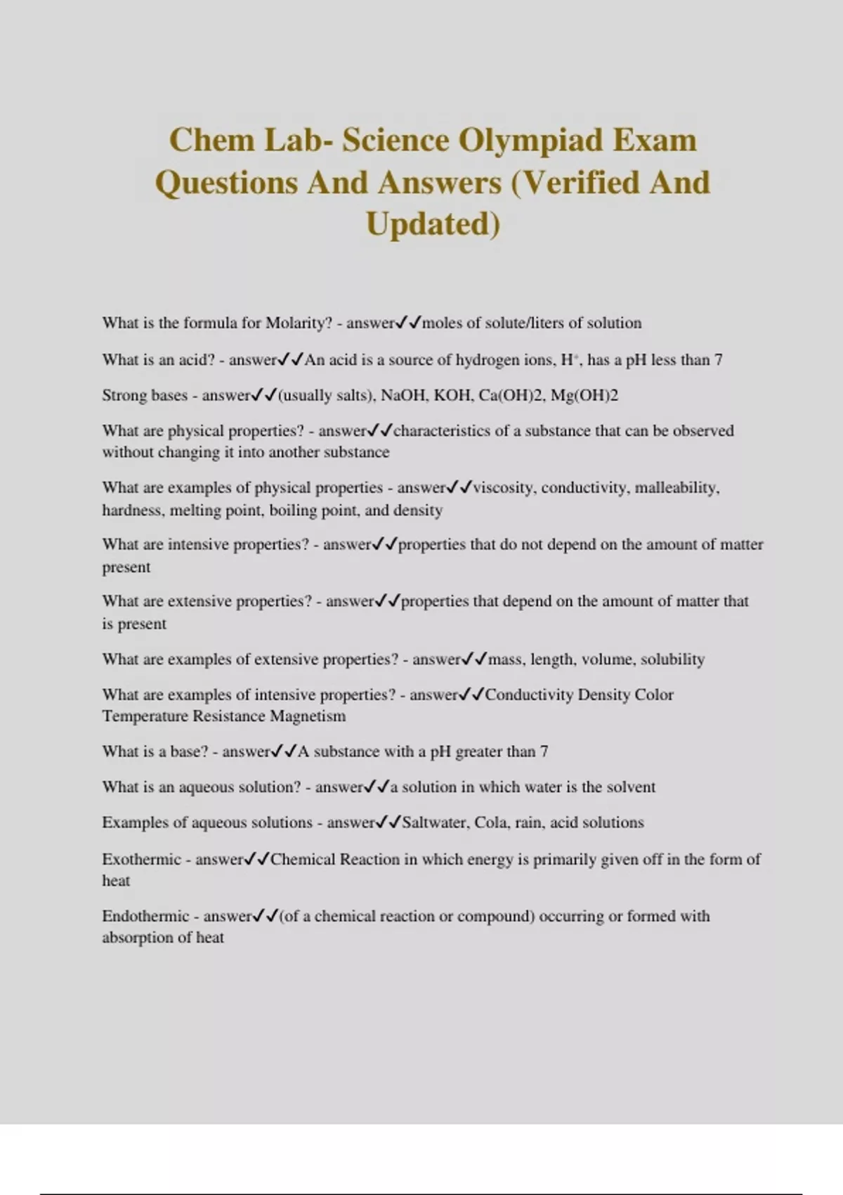 Chem Lab- Science Olympiad Exam Questions And Answers (Verified And Updated) What is the formula for Molarity? - answermoles of solute/liters of solution What is an acid? - answerAn acid is a source of hydrogen ions, H⁺, has a pH less than 7 Strong bases - answer(usually salts), NaOH, KOH, Ca(OH)2, Mg(OH)2 What are physical properties? - answercharacteristics of a substance that can be observed without changing it into another substance What are examples of physical properties - answerviscosity, conductivity, malleability, hardness, melting point, boiling point, and density What are intensive properties? - answerproperties that do not depend on the amount of matter present What are extensive properties? - answerproperties that depend on the amount of matter that is present What are examples of extensive properties? - ans