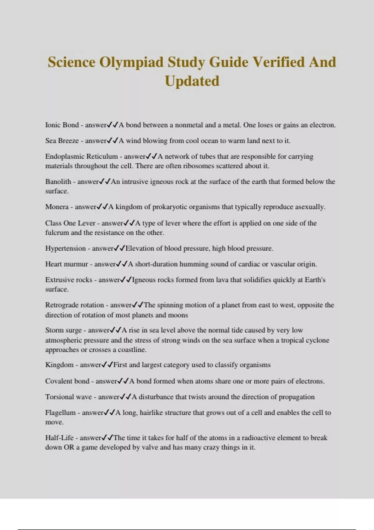 Science Olympiad Study Guide Verified And Updated Ionic Bond - answerA bond between a nonmetal and a metal. One loses or gains an electron. Sea Breeze - answerA wind blowing from cool ocean to warm land next to it. Endoplasmic Reticulum - answerA network of tubes that are responsible for carrying materials throughout the cell. There are often ribosomes scattered about it. Banolith - answerAn intrusive igneous rock at the surface of the earth that formed below the surface. Monera - answerA kingdom of prokaryotic organisms that typically reproduce asexually. Class One Lever - answerA type of lever where the effort is applied on one side of the fulcrum and the resistance on the other. Hypertension - answerElevation of blood pressure, high blood pressure. Heart murmur - answerA short-duration humming sound of cardiac or vascular origin. Extrusive rocks - answerIgneous rocks formed from lava that solidifies quickly at Earth's surface. Retrograde rotation - answerThe spinning motion of a planet from east to west, opposite the direction of rotation of most planets and moons Storm surge - answerA rise in sea level above the normal tide caused by very low atmospheric pressure and the stress of strong winds on the sea surface when a tropical cyclone approaches or crosses a coastline. Kingdom - answerFirst and largest category used to classify organisms Covalent bond - answerA bond formed when atoms share one or more pairs of electrons. Torsional wave - answerA disturbance that twists around the direction of propagation Flagellum - answerA long, hairlike structure that grows out of a cell and enables the cell to move. Half-Life - answerThe time it takes for half of the atoms in a radioactive element to break down OR a game developed by valve and has many crazy things in it. DNA Fingerprint - answerDetermining an individual's unique collection of DNA restriction fragments, detected by electrophoresis and nucleic acid probes. Metaphase - answerChromosomes align themselves along the center of the cells. Concave Lens - answerA lens that is thinner in the middle than at the edges. Eukaryotic Cell - answerCell with a nucleus (surrounded by its own membrane) and other internal organelles. Greenhouse Effect - answerNatural situation in which heat is retained in Earth's atmosphere by carbon dioxide, methane, water vapor, and other gases. Transpiration - answerEvaporation of water from the leaves of a plant Femur - answerA heavy, long bone that forms the leg above the knee Allele - answerAn alternative form of a gene. Hypertonic - answerA solution that has a higher concentration of solutes than another. Deoxyribonucleic Acid - answerDNA - a chemical that contains information that an organism needs for growth and function. Rock Cycle - answerA series of processes on the surface and inside Earth that slowly changes rocks from one kind to another Torque - answerA force that causes rotation Oxidation - answerLoss of electrons Neutron Star - answerA star that has collapsed under gravity to the point that the electrons and protons have smashed together to form neutrons. Inorganic Compound - answerA compound that does not contain the element carbon or contains carbon bound to elements other than hydrogen. Protein Synthesis - answerHow proteins are made Angular Momentum - answerProduct of rotational inertia and rotational velocity Gene Recombination - answerA natural process in which a nucleic acid molecule (usually DNA but can be RNA) is broken and then joined to a different molecule; a result of crossing‐ over. Polarization - answerDistribution of ions on either side of cell membrane; in a resting neuron or muscle cell, sodium ions and positive charge outside and potassium ions and negative charge inside