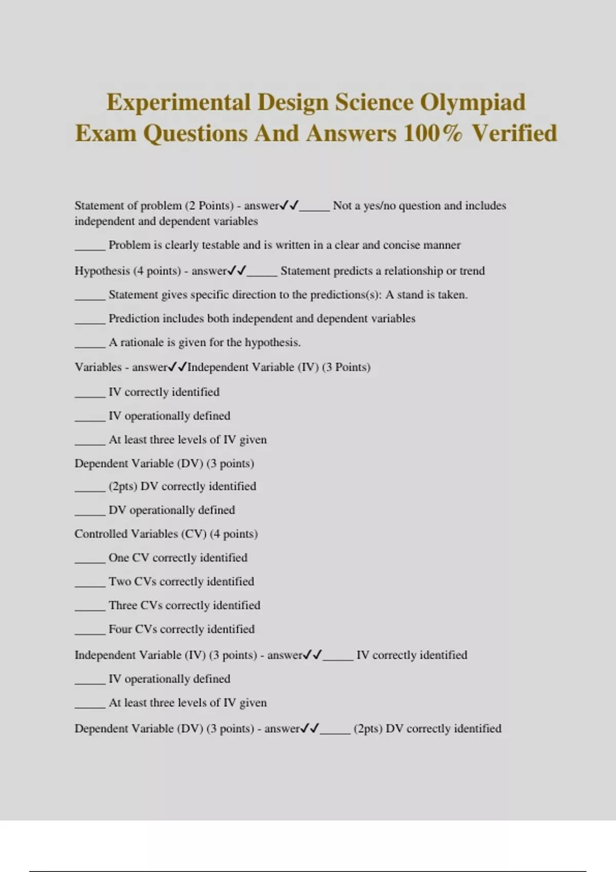 Experimental Design Science Olympiad Exam Questions And Answers 100% Verified Statement of problem (2 Points) - answer_____ Not a yes/no question and includes independent and dependent variables _____ Problem is clearly testable and is written in a clear and concise manner Hypothesis (4 points) - answer_____ Statement predicts a relationship or trend _____ Statement gives specific direction to the predictions(s): A stand is taken. _____ Prediction includes both independent and dependent variables _____ A rationale is given for the hypothesis. Variables - answerIndependent Variable (IV) (3 Points) _____ IV correctly identified _____ IV operationally defined _____ At least three levels of IV given Dependent Variable (DV) (3 points) _____ (2pts) DV correctly identified _____ DV operationally defined Controlled Variables (CV) (4 points) _____ One CV correctly identified _____ Two CVs correctly identified _____ Three CVs correctly identified _____ Four CVs correctly identified Independent Variable (IV) (3 points) - answer_____ IV correctly identified _____ IV operationally defined _____ At least three levels of IV given Dependent Variable (DV) (3 points) - answer_____ (2pts) DV correctly identified