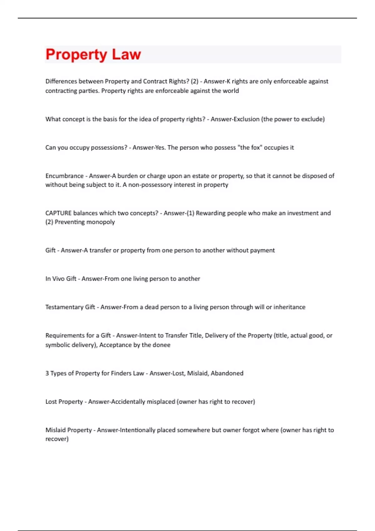 Differences between Property and Contract Rights? (2) - Answer-K rights are only enforceable against contracting parties. Property rights are enforceable against the world What concept is the basis for the idea of property rights? - Answer-Exclusion (the power to exclude) Can you occupy possessions? - Answer-Yes. The person who possess "the fox" occupies it Encumbrance - Answer-A burden or charge upon an estate or property, so that it cannot be disposed of without being subject to it. A non-possessory interest in property CAPTURE balances which two concepts? - Answer-(1) Rewarding people who make an investment and (2) Preventing monopoly Gift - Answer-A transfer or property from one person to another without payment In Vivo Gift - Answer-From one living person to another Testamentary Gift - Answer-From a dead person to a living person through will or inheritance Requirements for a Gift - Answer-Intent to Transfer Title, Delivery of the Property (title, actual good, or symbolic delivery), Acceptance by the donee 3 Types of Property for Finders Law - Answer-Lost, Mislaid, Abandoned Lost Property - Answer-Accidentally misplaced (owner has right to recover) Mislaid Property - Answer-Intentionally placed somewhere but owner forgot where (owner has right to recover)Abandoned - Answer-Owner intends to relinquish rights (finder has right to keep - but intent to abandon must be established) Unjust Enrichment in Property - Answer-(1) Enrichment (2) Impoverishment (3) Connection between enrichment and impoverishment (4) absence of justification or cause for either (5) No other remedy available to P Are burial good abandoned propery? - Answer-No. (but who owns them?) Who does a finder of property prevail over to keep the property? - Answer-Everyone but the original owner (generally) What happens when the finder is on someone else's land when he finds the property? - AnswerLandowner gets it if the finder was trespassing. Courts are divided when finder had permission to be on the land. Trespass (definition) - Answer-An unprivileged intentional intrusion on property possessed by another. Must establish the act was unprivileged and owner had right to exclude 3 Instances of Privileged Entry - Answer-Consent, Necessity, Public Policy Licensee - Answer-Person who has been given the right to be on the land Are privileges limited by the scope of the privilege? - Answer-Yes. When you exceed the scope of your privilege you are no longer privileged and become a trespasser The common law imposes a duty on which two groups to serve the public without discrimination? Policy behind this? - Answer-Innkeepers, Common Carriers. Policy -- more likely to be monopolies, necessities, hold themselves out as ready to serve public. 3 Types of Remedies for Trespass - Answer-Damages (nominal, compensatory, punitive), Injunction/Ejectment, Declaratory JudgmentElements of Adverse Possession - Answer-Actual Possession, Exclusive, Open & Notorious, Continuous (by average landowner standard), Adverse/Hostile, For a proscribed period of time (10 years usually. SoL) Acronym for Adverse Possession - OCEAN - Answer-Open, Continuous, Exclusive, Adverse, Notorious Tacking - Answer-Can add adverse possession claims from previous owners if they meet the adverse possession requirements Burden of Proof for Adverse Possession - Answer-Clear and Convincing Evidence Knowledge of the adverse possession required? - Answer-No. Not for either party.