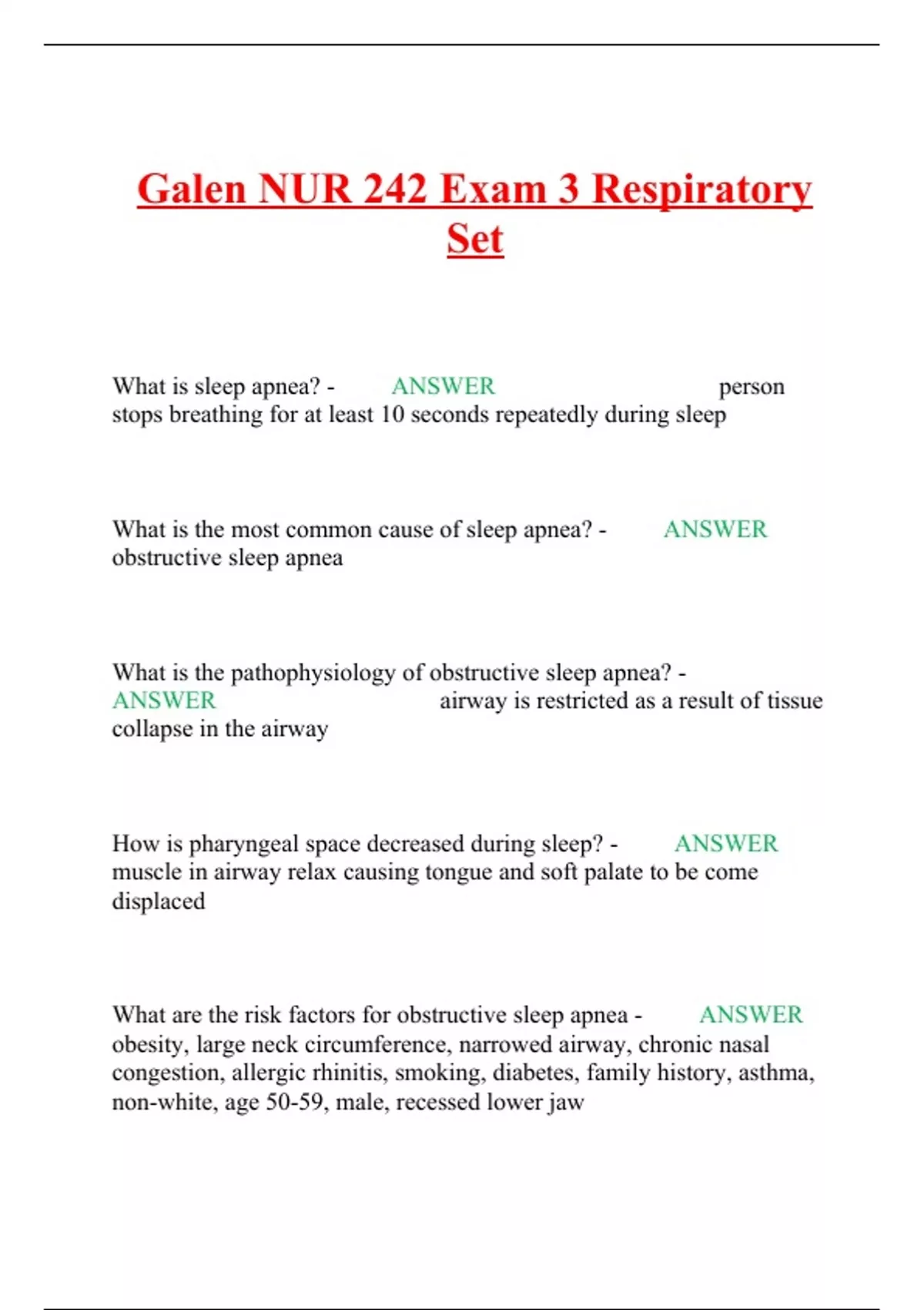Galen NUR 242 Exam 3 Respiratory Set What is sleep apnea? - ANSWER person stops breathing for at least 10 seconds repeatedly during sleep What is the most common cause of sleep apnea? - ANSWER obstructive sleep apnea What is the pathophysiology of obstructive sleep apnea? - ANSWER airway is restricted as a result of tissue collapse in the airway How is pharyngeal space decreased during sleep? - ANSWER muscle in airway relax causing tongue and soft palate to be come displaced What are the risk factors for obstructive sleep apnea - ANSWER obesity, large neck circumference, narrowed airway, chronic nasal congestion, allergic rhinitis, smoking, diabetes, family history, asthma, non-white, age 50-59, male, recessed lower jaw