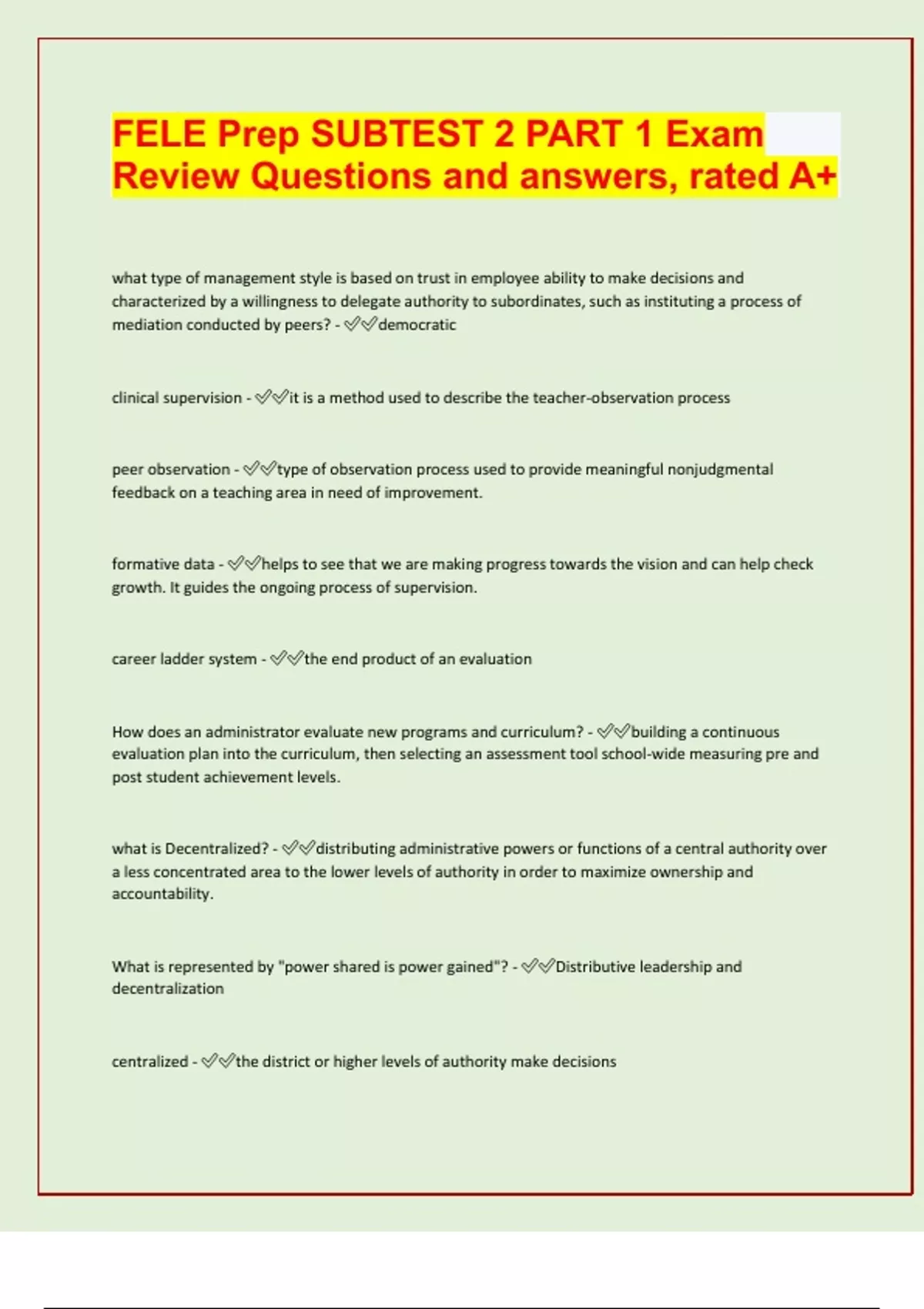 FELE Prep SUBTEST 2 PART 1 Exam Review Questions and answers, rated A+