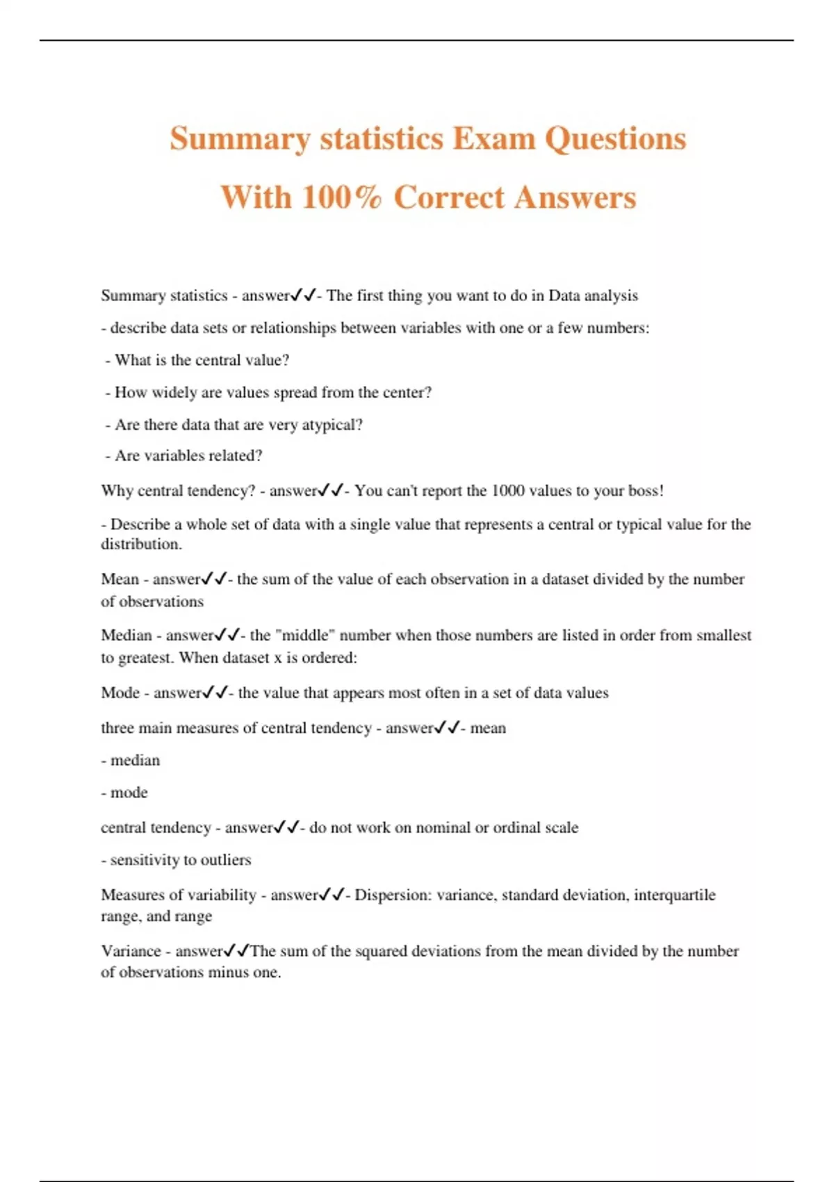 Summary statistics Exam Questions With 100% Correct Answers Summary statistics - answer- The first thing you want to do in Data analysis - describe data sets or relationships between variables with one or a few numbers: - What is the central value? - How widely are values spread from the center? - Are there data that are very atypical? - Are variables related? Why central tendency? - answer- You can't report the 1000 values to your boss! - Describe a whole set of data with a single value that represents a central or typical value for the distribution. Mean - answer- the sum of the value of each observation in a dataset divided by the number of observations Median - answer- the "middle" number when those numbers are listed in order from smallest to greatest. When dataset x is ordered: Mode - answer- the value that appears most often in a set of data values three main measures of central tendency - answer- mean - median - mode central tendency - answer- do not work on nominal or ordinal scale - sensitivity to outliers Measures of variability - answer- Dispersion: variance, standard deviation, interquartile range, and range Variance - answerThe sum of the squared deviations from the mean divided by the number of observations minus one.