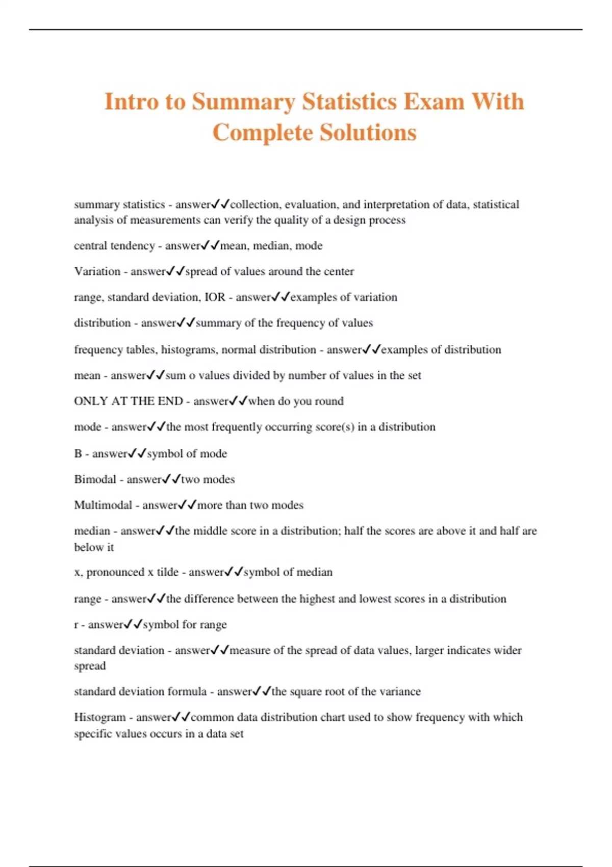 Intro to Summary Statistics Exam With Complete Solutions summary statistics - answercollection, evaluation, and interpretation of data, statistical analysis of measurements can verify the quality of a design process central tendency - answermean, median, mode Variation - answerspread of values around the center range, standard deviation, IOR - answerexamples of variation distribution - answersummary of the frequency of values frequency tables, histograms, normal distribution - answerexamples of distribution mean - answersum o values divided by number of values in the set