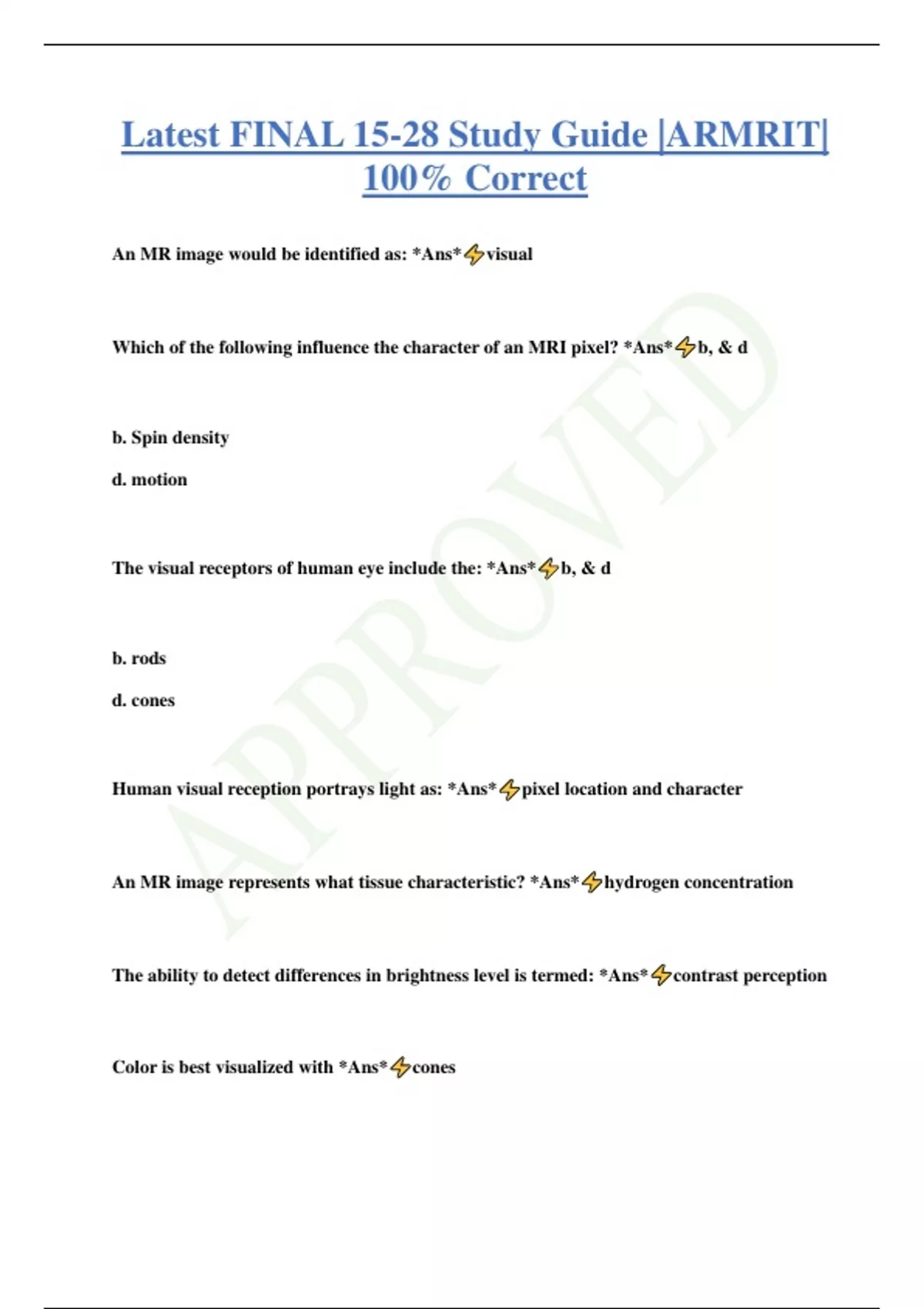 Latest FINAL 15-28 Study Guide |ARMRIT| 100% Correct An MR image would be identified as: *Ans* visual Which of the following influence the character of an MRI pixel? *Ans* b, & d b. Spin density d. motion The visual receptors of human eye include the: *Ans* b, & d b. rods d. cones Human visual reception portrays light as: *Ans* pixel location and character An MR image represents what tissue characteristic? *Ans* hydrogen concentration The ability to detect differences in brightness level is termed: *Ans* contrast perception Color is best visualized with *Ans* cones An MR image has two principle characteristics: *Ans* contrast resolution and spatial resolution When evaluation the gross anatomy visible in an MR image, the basic geometric factors are: *Ans* a, b, & c a. size b. shape c. position When evaluating the position of an anatomical structure in an MR image, the possibilities include: *Ans* a, b, & c a. normal b. intrinsically malpositioned c. extrinsically displaced Pixel location is determined by: *Ans* magnetic field gradients The number of principle MR imaging parameters matches the number of primary colors. That number is: *Ans* thre