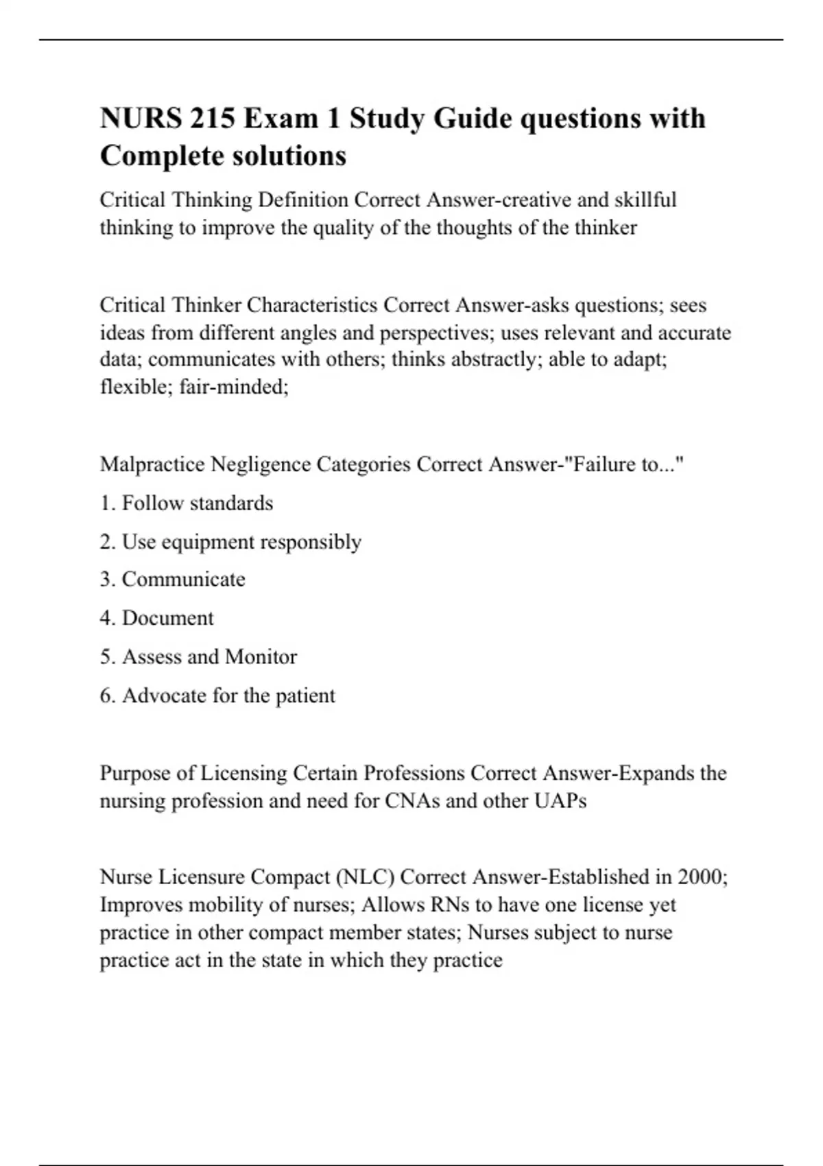 NURS 215 Exam 1 Study Guide questions with Complete solutions
