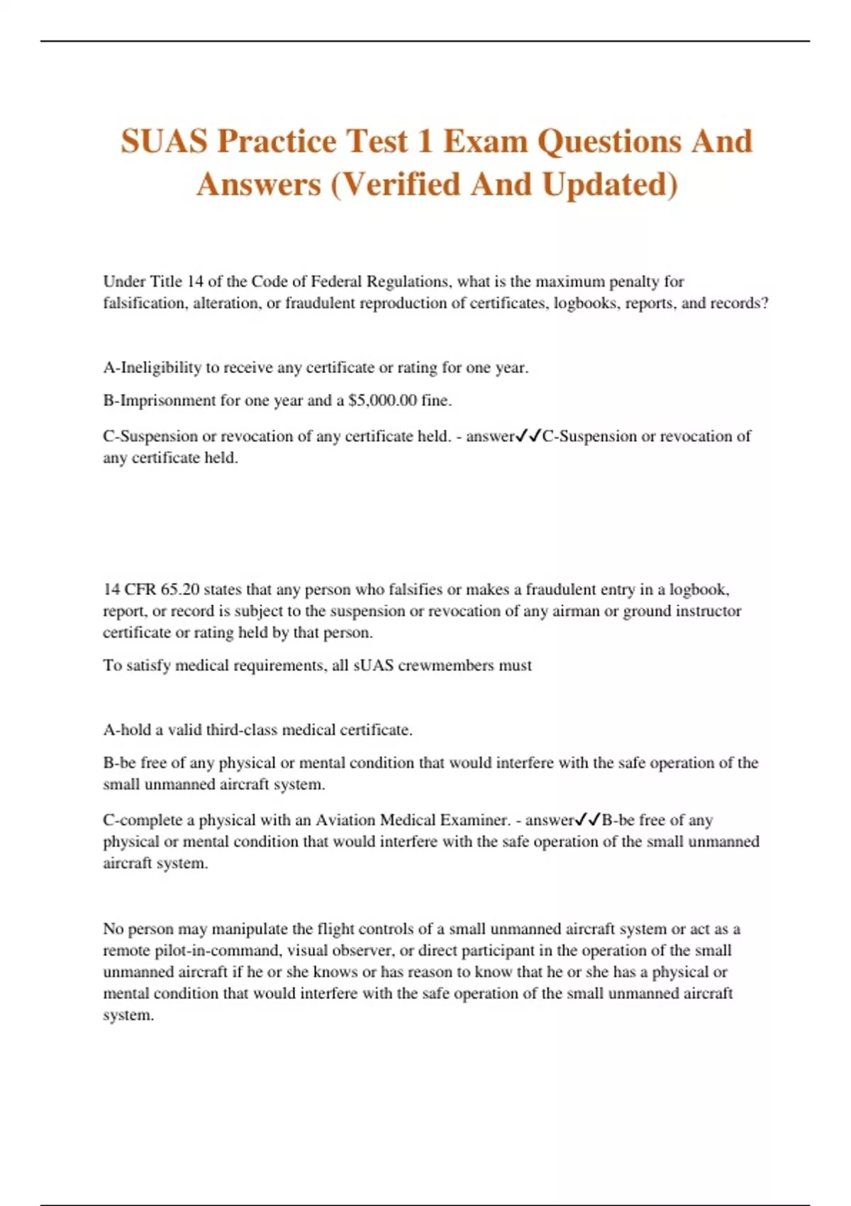 SUAS Practice Test 1 Exam Questions And Answers (Verified And Updated) Under Title 14 of the Code of Federal Regulations, what is the maximum penalty for falsification, alteration, or fraudulent reproduction of certificates, logbooks, reports, and records? A-Ineligibility to receive any certificate or rating for one year. B-Imprisonment for one year and a $5,000.00 fine. C-Suspension or revocation of any certificate held. - answerC-Suspension or revocation of any certificate held. 14 CFR 65.20 states that any person who falsifies or makes a fraudulent entry in a logbook, report, or record is subject to the suspension or revocation of any airman or ground instructor certificate or rating held by that person. To satisfy medical requirements, all sUAS crewmembers must A-hold a valid third-class medical certificate. B-be free of any physical or mental condition that would interfere with the safe operation of the small unmanned aircraft system. C-complete a physical with an Aviation Medical Examiner. - answerB-be free of any physical or mental condition that would interfere with the safe operation of the small unmanned aircraft system. No person may manipulate the flight controls of a small unmanned aircraft system or act as a remote pilot-in-command, visual observer, or direct participant in the operation of the small unmanned aircraft if he or she knows or has reason to know that he or she has a physical or mental condition that would interfere with the safe operation of the small unmanned aircraft system. If requested, to whom must I present my Remote Pilot Certificate? A-A person of authority. B-FAA Inspector. C-Authorized representative of the Department of State. - answerB-FAA Inspector. A remote pilot-in-command, owner, or person manipulating the flight controls of a small unmanned aircraft system must, upon request, make available to the Administrator: (1) the remote pilot certificate with a small UAS rating; and (2) any other document, record, or report required. Whose sole task during an sUAS operation is to watch the sUAS and report potential hazards to the rest of the crew? A-Remote Pilot in Command. B-Remote Pilot in Command. C-Visual Observer. - answerC-Visual Observer. The visual observer (when asked by the remote PIC) maintains visual line of sight with the sUAS and reports any potential hazards to the remote PIC and person manipulating the controls. A professional wildlife photographer operates an sUAS from a moving truck to capture aerial images of migrating birds in remote wetlands. The driver of the truck does not serve any crewmember role in the operation. Is this sUAS operation in compliance with 14 CFR Part 107? A-Compliant with Part 107. B-Not compliant with Part 107. C-Not compliant with state and local traffic laws. - answerA-Compliant with Part 107. You may operate an sUAS from a moving vehicle if you are in a sparsely populated area and the driver does not serve as the remote PIC, person manipulating the controls, or visual observer. While operating a small unmanned aircraft system (sUAS), you experience a flyaway and several people suffer injuries. Which of the following injuries requires reporting to the FAA? A-An injury requiring an overnight hospital stay. B-Scrapes and cuts bandaged on site. C-Minor bruises. - answerA-An injury requiring an overnight hospital stay. The remote PIC must report any sUAS accident to the FAA, within 10 days of the operation, if a serious injury to any person or any loss of consciousness occurs. It would be considered a serious injury if a person requires hospitalization. Sunrise is 0645. When can you launch your sUAS operation? A-0645. B-0615. C-0715. - answerB-0615. A remote pilot may not act as pilot-in-command of an sUAS at night. Night is defined as the time between the end of evening civil twilight and the beginning of morning civil twilight. Morning civil twilight is the period 30 minutes prior to sunrise until sunrise. This means you can launch your sUAS operation 30 minutes prior to sunrise. Each person who holds a pilot certificate, a U.S. driver's license, or a medical certificate shall present it for inspection upon the request of the Administrator, the National Transportation Safety Board, or any A-authorized Administrator of the Department of Transportation. B-authorized representative of the Department of State. C-federal, state, or local law enforcement officer. - answerA-authorized Administrator of the Department of Transportation. A remote pilot-in-command, owner, or person manipulating the flight controls of a small unmanned aircraft system must, upon request, make available to the Administrator: (1) the remote pilot certificate with a small UAS rating; and (2) any other document, record, or report required.