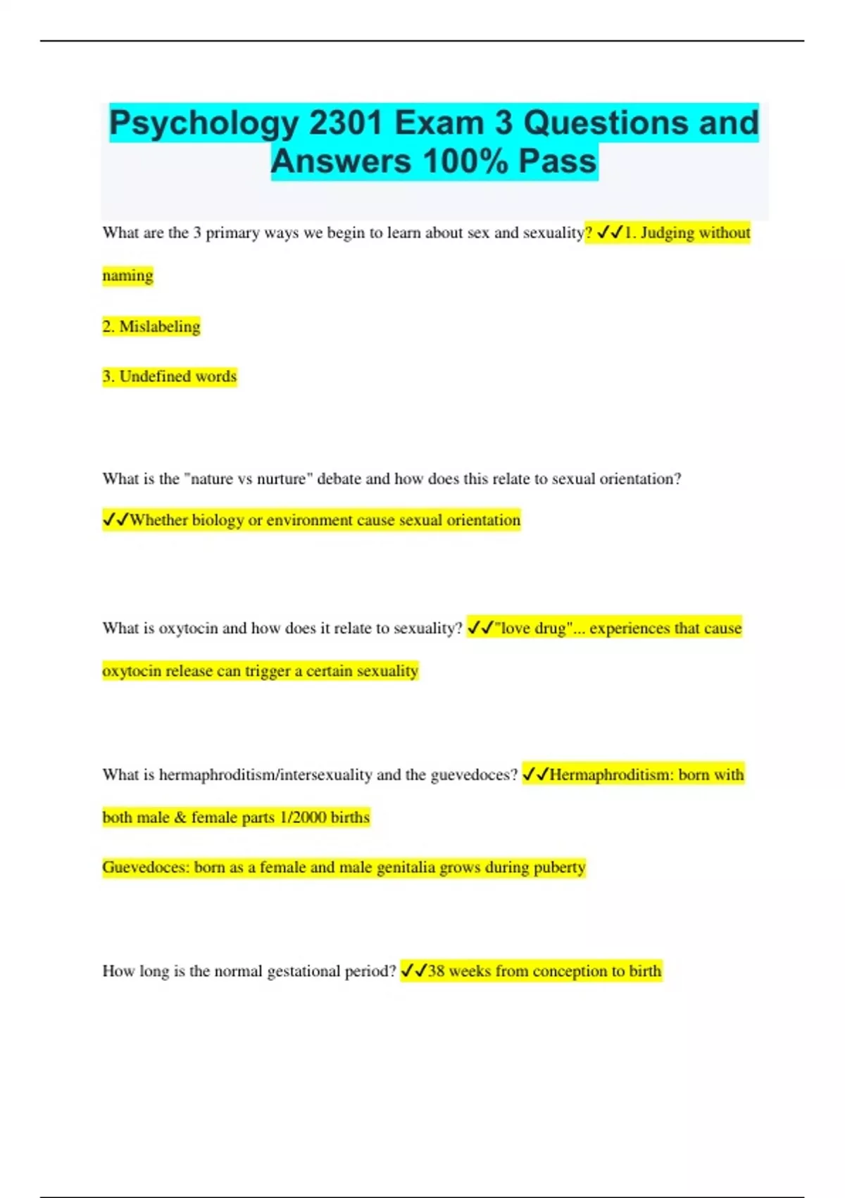 Psychology 2301 Exam 3 Questions and Answers 100% Pass What are the 3 primary ways we begin to learn about sex and sexuality? 1. Judging without naming 2. Mislabeling 3. Undefined words What is the "nature vs nurture" debate and how does this relate to sexual orientation? Whether biology or environment cause sexual orientation What is oxytocin and how does it relate to sexuality? "love drug"... experiences that cause oxytocin release can trigger a certain sexuality What is hermaphroditism/intersexuality and the guevedoces? Hermaphroditism: born with both male & female parts 1/2000 births Guevedoces: born as a female and male genitalia grows during puberty How long is the normal gestational period? 38 weeks from conception to birth (40 weeks from last period to birth) What are the 3 stages of gestation (include what happens in those stages)? 1. Germinal 2. Embryonic 3. Fetal Germinal (0-2 weeks) -Fertilized ovum travels down fallopian tube and attaches to uterine wall -Single cell multiplies Embryonic (2-8 weeks) -Placenta forms between mother and embryo (connected by umbilical cord) -by the end of the 7th week, embryo is surrounded by the amniotic sac and suspended in fluid Fetal (9 weeks-birth) -Development of first bone* -3-4 months, has heartbeat What is vernix, lanugo and fontanelle? (hint: They are not the names of the Teenage Mutant Ninja Turtles) Birth things... -Vernix: collagen based substance for protection -Lanugo: light feathery hairs around jawline, back, and neck -Fontanelle: "cone head" caused by passage through birth canal What is the APGAR scale? Used to rate overall health What is APGAR an acronym for and how is it scored? -Appearance, Pulse, Grimace, Activity, Respiration -Each category is rated 0-2 What temporary reflexes are infants born with? -Babinski (monkey toes)- hell to toe -Rooting- stroke baby's cheek, turns in