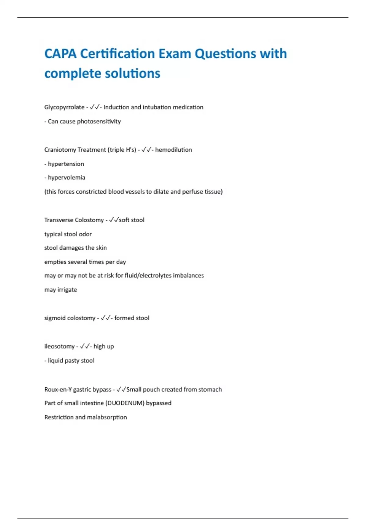 CAPA Certification Exam Questions with complete solutions Glycopyrrolate - - Induction and intubation medication - Can cause photosensitivity Craniotomy Treatment (triple H's) - - hemodilution - hypertension - hypervolemia (this forces constricted blood vessels to dilate and perfuse tissue) Transverse Colostomy - soft stool typical stool odor stool damages the skin empties several times per day may or may not be at risk for fluid/electrolytes imbalances may irrigate sigmoid colostomy - - formed stool ileosotomy - - high up - liquid pasty stool Roux-en-Y gastric bypass - Small pouch created from stomach Part of small intestine (DUODENUM) bypassed Restriction and malabsorption Post-op Stroke symptoms - - double vision - headache - sudden dizziness Metoclopramide (Reglan) - - controls post-op NV - can have extrapyrmidal side effects like tardive dyskinesia Gastrectomy Interventions - - encourage deep breaths - and position shifts clonic seizure - repetitive jerking movements petit mal seizure - Also called absence attack. A seizure that is characterized by a spike-and-wave EEG and often involves a loss of awareness and inability to recall events surrounding the seizure. Tonic seizure - sustained muscle contraction Emergence excitement safety interventions - ok to use wrist restraints Shivering first interventions - - anticipate order for demerol (over warm blankets) Septic Shock/ Early Respiratory Distress - - Hyperventilation - Respiratory Alkalosis - Elevated Lactate Levels Interscalene nerve block - anesthetizes the brachial plexus as it passes through the scalene triangle. It