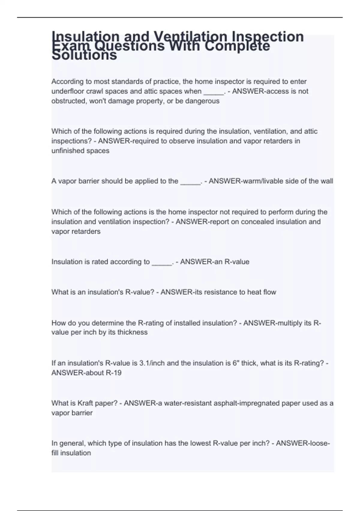 Insulation and Ventilation Inspection Exam Questions With Complete Solutions