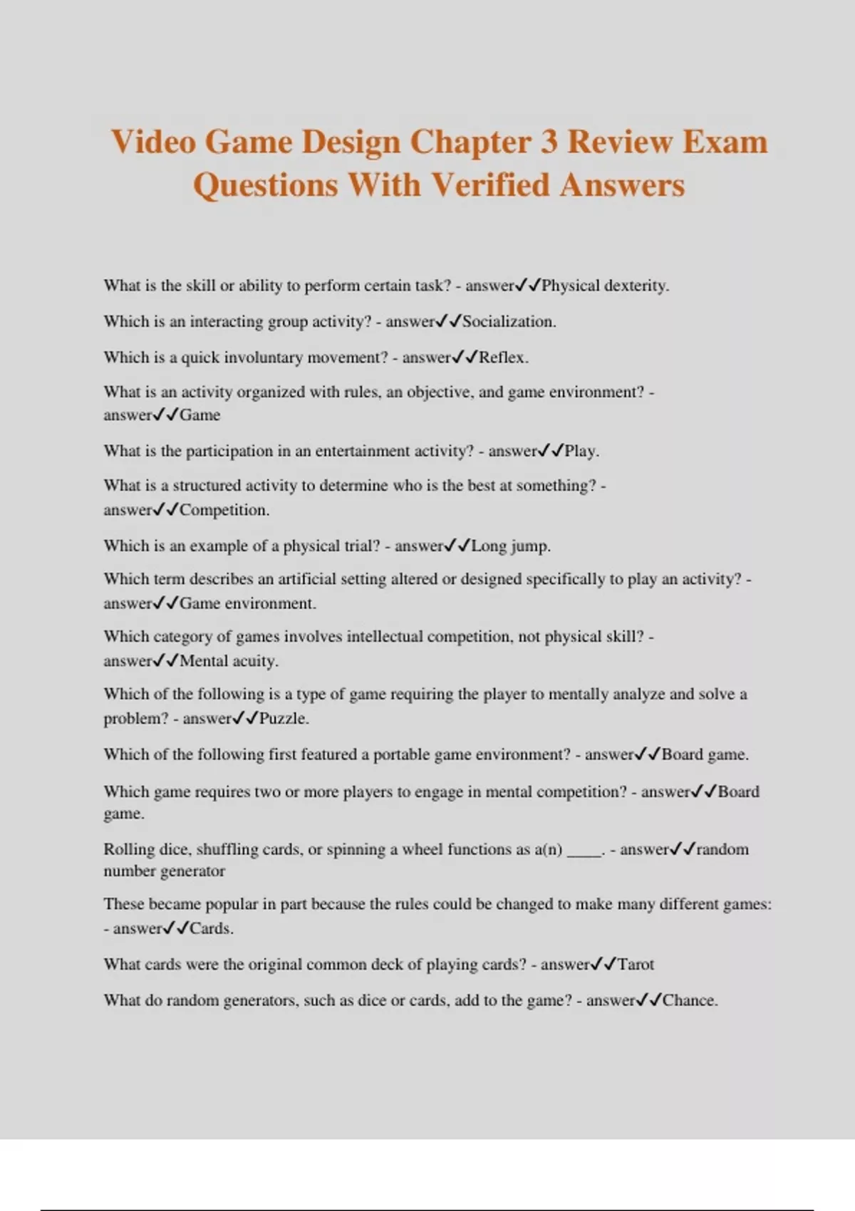 Video Game Design Chapter 3 Review Exam Questions With Verified Answers What is the skill or ability to perform certain task? - answerPhysical dexterity. Which is an interacting group activity? - answerSocialization. Which is a quick involuntary movement? - answerReflex. What is an activity organized with rules, an objective, and game environment? - answerGame What is the participation in an entertainment activity? - answerPlay. What is a structured activity to determine who is the best at something? - answerCompetition. Which is an example of a physical trial? - answerLong jump. Which term describes an artificial setting altered or designed specifically to play an activity? - answerGame environment. Which category of games involves intellectual competition, not physical skill? - answerMental acuity. Which of the following is a type of game requiring the player to mentally analyze and solve a problem? - answerPuzzle. Which of the following first featured a portable game environment? - answerBoard game. Which game requires two or more players to engage in mental competition? - answerBoard game. Rolling dice, shuffling cards, or spinning a wheel functions as a(n) ____. - answerrandom number generator These became popular in part because the rules could be changed to make many different games: - answerCards. What cards were the original common deck of playing cards? - answerTarot What do random generators, such as dice or cards, add to the game? - answerChance.