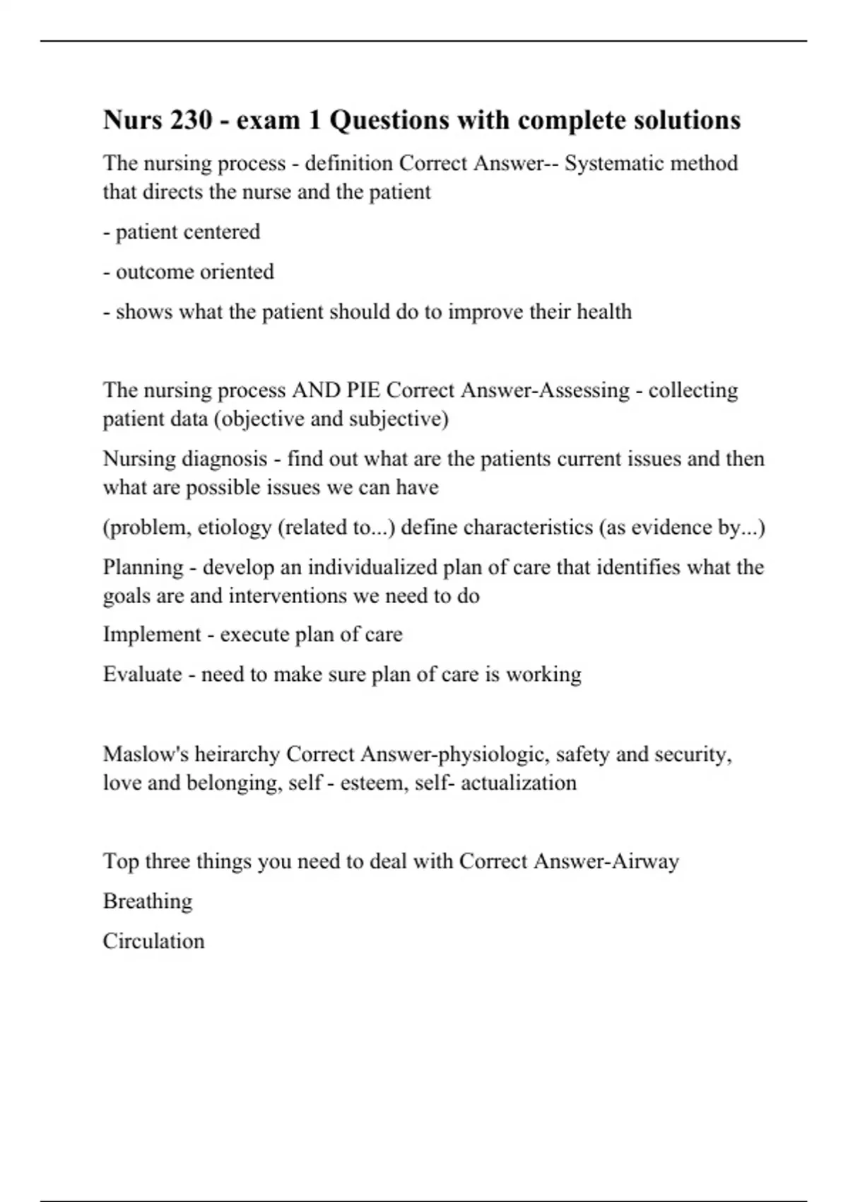 Maslow's heirarchy Correct Answer-physiologic, safety and security, love and belonging, self - esteem, self- actualization
