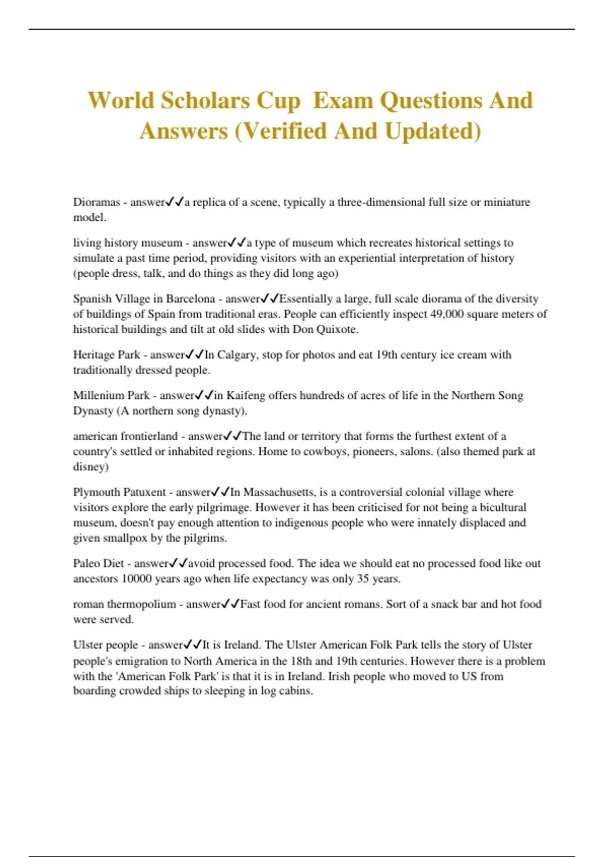 World Scholars Cup Exam Questions And Answers (Verified And Updated) Dioramas - answera replica of a scene, typically a three-dimensional full size or miniature model. living history museum - answera type of museum which recreates historical settings to simulate a past time period, providing visitors with an experiential interpretation of history (people dress, talk, and do things as they did long ago) Spanish Village in Barcelona - answerEssentially a large, full scale diorama of the diversity of buildings of Spain from traditional eras. People can efficiently inspect 49,000 square meters of historical buildings and tilt at old slides with Don Quixote. Heritage Park - answerIn Calgary, stop for photos and eat 19th century ice cream with traditionally dressed people. Millenium Park - answerin Kaifeng offers hundreds of acres of life in the Northern Song Dynasty (A northern song dynasty). american frontierland - answerThe land or territory that forms the furthest extent of a country's settled or inhabited regions. Home to cowboys, pioneers, salons. (also themed park at disney) Plymouth Patuxent - answerIn Massachusetts, is a controversial colonial village where visitors explore the early pilgrimage. However it has been criticised for not being a bicultural museum, doesn't pay enough attention to indigenous people who were innately displaced and given smallpox by the pilgrims. Paleo Diet - answeravoid processed food. The idea we should eat no processed food like out ancestors 10000 years ago when life expectancy was only 35 years. roman thermopolium - answerFast food for ancient romans. Sort of a snack bar and hot food were served. Ulster people - answerIt is Ireland. The Ulster American Folk Park tells the story of Ulster people's emigration to North America in the 18th and 19th centuries. However there is a problem with the 'American Folk Park' is that it is in Ireland. Irish people who moved to US from boarding crowded ships to sleeping in log cabins. Dysentery - answerDysentery is an infection of the intestines that causes diarrhoea containing blood or mucus. Great Emu War - answerin 1932, Australia declared war on emus. Western Australian farmers had been facing hard times with their crops following the Great Depression, and their difficulties increased tenfold with the arrival of some 20,000 emus migrating inland during their breeding season. The birds had been protected as a native species until 1922, but now that they were classified as "vermin," all bets were off. Renaissance Fairs - answera fair that celebrate the renaissance period of history. Bruce Coville's 1986 novel Operation Sherlock - answerIn Bruce Coville's 1986 novel Operation Sherlock, six teenagers have no history teacher—their parents are rogue scientists developing the first AI on an otherwise uninhabited island. videogames as a way of revisiting history - answerThe Oregon Trail | Seven Cities of Gold | Sid Meier's Pirates! | Call of Duty Ghost of Tsushima | Age of Empires | Assassin's Creed | Railroad Tycoon what critisism did the Oregon trail game face? - answerthe game has also been criticized for celebrating imperialism, for discounting the cost of environmental destruction, and for ignoring the perspective of the indigenous peoples whose lands were being trampled—it was, in a sense, the Oregon Trail of Tears. what is a column (literature) - answerA column is a recurring piece or article in a newspaper, magazine or other publication, where a writer expresses their own opinion in few columns allotted to them by the newspaper organisation. Presentism - answerfocusing too much on the 20th and 21st centuries—and against sifting selectively though the past to find support for their current social agendas. President of the American Historical Association warned about this. list actresses who played princess diana - answerKristen Stewart. Jeanna De Waal Emma Corrin Elizabeth Debicki Bonnie Soper Naomi Watts list actors who played nelson mandella - answerDennis Haysbert, Danny Glover and Sidney Poitier have also taken turns at playing Mandela. Morgan Freeman.