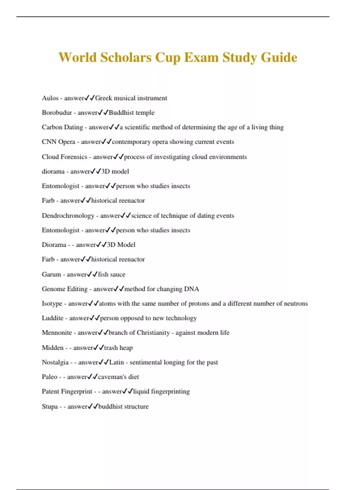 World Scholars Cup Exam Study Guide Aulos - answerGreek musical instrument Borobudur - answerBuddhist temple Carbon Dating - answera scientific method of determining the age of a living thing CNN Opera - answercontemporary opera showing current events Cloud Forensics - answerprocess of investigating cloud environments diorama - answer3D model Entomologist - answerperson who studies insects Farb - answerhistorical reenactor Dendrochronology - answerscience of technique of dating events Entomologist - answerperson who studies insects Diorama - - answer3D Model Farb - answerhistorical reenactor Garum - answerfish sauce Genome Editing - answermethod for changing DNA Isotype - answeratoms with the same number of protons and a different number of neutrons Luddite - answerperson opposed to new technology Mennonite - answerbranch of Christianity - against modern life Midden - - answertrash heap Nostalgia - - answerLatin - sentimental longing for the past Paleo - - answercaveman's diet Patent Fingerprint - - answerliquid fingerprinting Stupa - - answerbuddhist structure Thermopolium - - answerAncient Roman Snack Bar Toxicology - - answerstudy of poisons Tripitaka - - answerBuddhist Temple - Indonesia Turing Test - - answertest machine does to see if it Auroch - - answerextinct wild ox Great Emu War - answerKilled emus because destroyed crops;Australia Spike Jonze - answerAmerican Filmmaker films;her Toscanini - answerfamous orchestra conductor;Italian Koh Buck - answerSingaporean writer; brand singapore Guy Gavriel Kay - answerCanadian Writer; tigana Oregon Trail Game - answerwagon road stretching 2170 miles from Missouri to Oregon's Willamette Valley Nelson Mandela - answerFirst black president of South Africa; nobel prize winner;fought for equal rights Sidney Poiter played him Princess Diana - answerMarried Prince Charles, son of Queen Elizabeth II of England in 1981/ Died in car accident being chased by paparazzi in 1997. Actress: Kristen Stewart Abraham lincoln - answer16th President of the United States;set free slaves Walter Huston played him Ben Kingsley - answerGandhi - 1982;actor Margaret Thatcher - answerFirst woman Prime Minister of Britain; conservative party;died 2013 John Milton - answerAuthor of Paradise Lost Backyard Guernica - answerpainting by picasso Millenium City park - answerpark in Kaifeng china The Woman King - answermovie directed by Gina Prince-Bythewood Jurassic Park - answermovie of dinosaurs, directed by steve spilberg American Chestnut - answerPlant