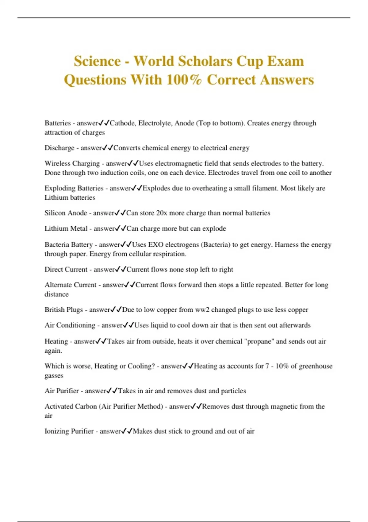 Science - World Scholars Cup Exam Questions With 100% Correct Answers Batteries - answerCathode, Electrolyte, Anode (Top to bottom). Creates energy through attraction of charges Discharge - answerConverts chemical energy to electrical energy Wireless Charging - answerUses electromagnetic field that sends electrodes to the battery. Done through two induction coils, one on each device. Electrodes travel from one coil to another Exploding Batteries - answerExplodes due to overheating a small filament. Most likely are Lithium batteries Silicon Anode - answerCan store 20x more charge than normal batteries Lithium Metal - answerCan charge more but can explode Bacteria Battery - answerUses EXO electrogens (Bacteria) to get energy. Harness the energy through paper. Energy from cellular respiration. Direct Current - answerCurrent flows none stop left to right Alternate Current - answerCurrent flows forward then stops a little repeated. Better for long distance British Plugs - answerDue to low copper from ww2 changed plugs to use less copper Air Conditioning - answerUses liquid to cool down air that is then sent out afterwards Heating - answerTakes air from outside, heats it over chemical "propane" and sends out air again. Which is worse, Heating or Cooling? - answerHeating as accounts for 7 - 10% of greenhouse gasses Air Purifier - answerTakes in air and removes dust and particles Activated Carbon (Air Purifier Method) - answerRemoves dust through magnetic from the air Ionizing Purifier - answerMakes dust stick to ground and out of air
