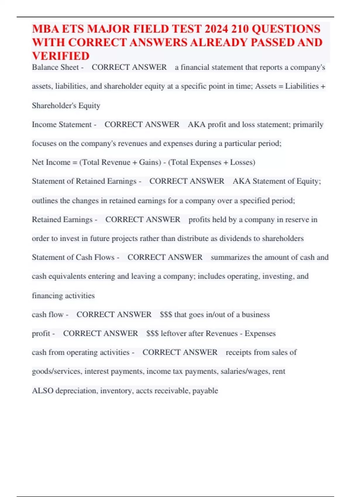 MBA ETS MAJOR FIELD TEST 2024 210 QUESTIONS WITH CORRECT ANSWERS ALREADY PASSED AND VERIFIED Balance Sheet - CORRECT ANSWER a financial statement that reports a company's assets, liabilities, and shareholder equity at a specific point in time; Assets = Liabilities + Shareholder's Equity Income Statement - CORRECT ANSWER AKA profit and loss statement; primarily focuses on the company's revenues and expenses during a particular period; Net Income = (Total Revenue + Gains) - (Total Expenses + Losses) Statement of Retained Earnings - CORRECT ANSWER AKA Statement of Equity; outlines the changes in retained earnings for a company over a specified period; Retained Earnings - CORRECT ANSWER profits held by a company in reserve in order to invest in future projects rather than distribute as dividends to shareholders Statement of Cash Flows - CORRECT ANSWER summarizes the amount of cash and cash equivalents entering and leaving a company; includes operating, investing, and financing activities cash flow - CORRECT ANSWER $$$ that goes in/out of a business profit - CORRECT ANSWER $$$ leftover after Revenues - Expenses cash from operating activities - CORRECT ANSWER receipts from sales of goods/services, interest payments, income tax payments, salaries/wages, rent ALSO depreciation, inventory, accts receivable, payable