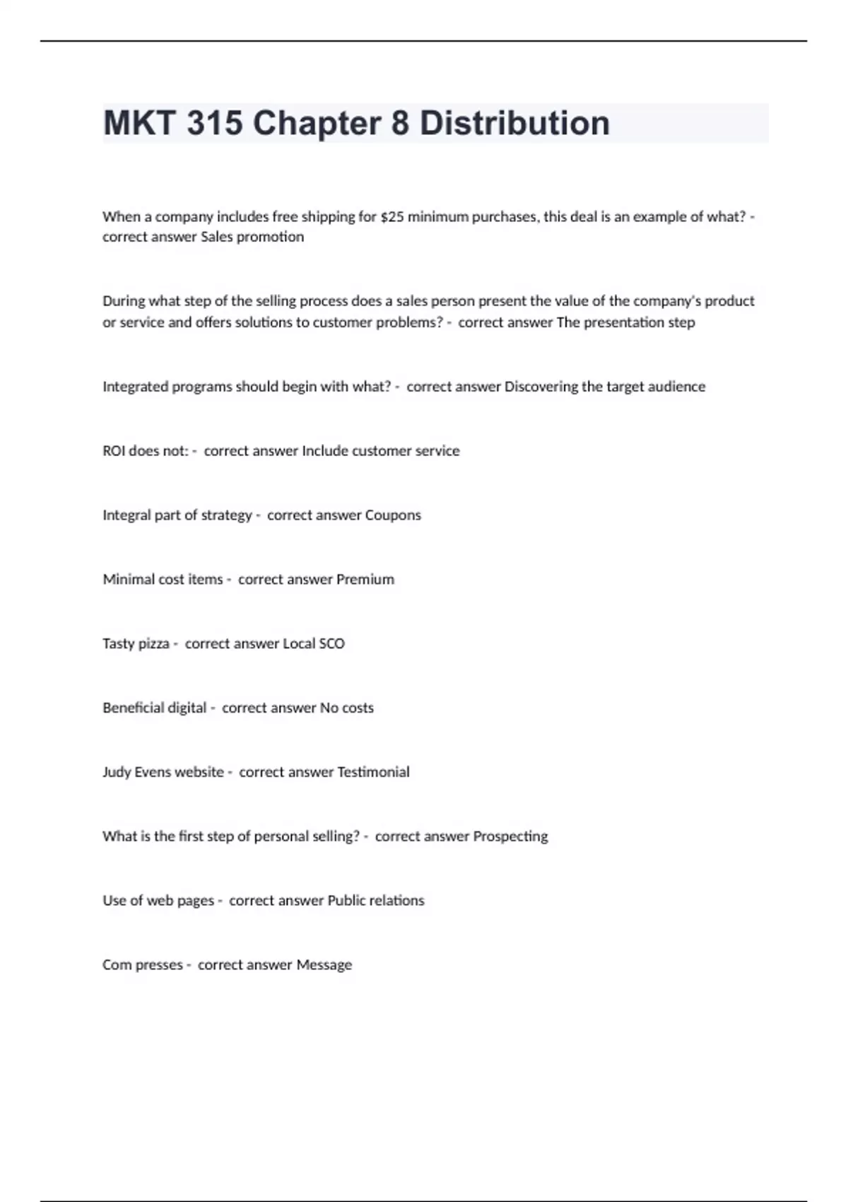 MKT 315 Chapter 8 Distribution questions and answers already solved 2024