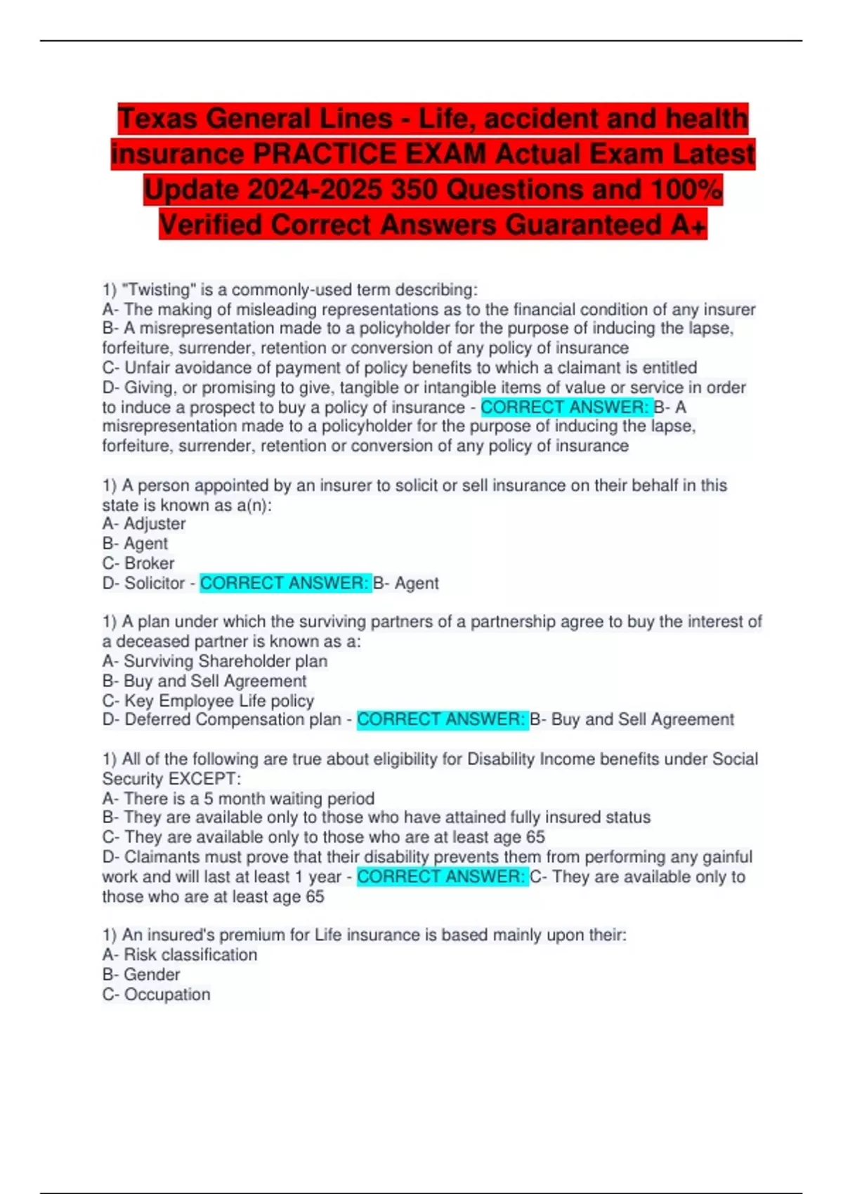 Texas General Lines - Life, accident and health insurance PRACTICE EXAM Actual Exam Latest Update Questions and 100% Verified Correct Answers Guaranteed A+