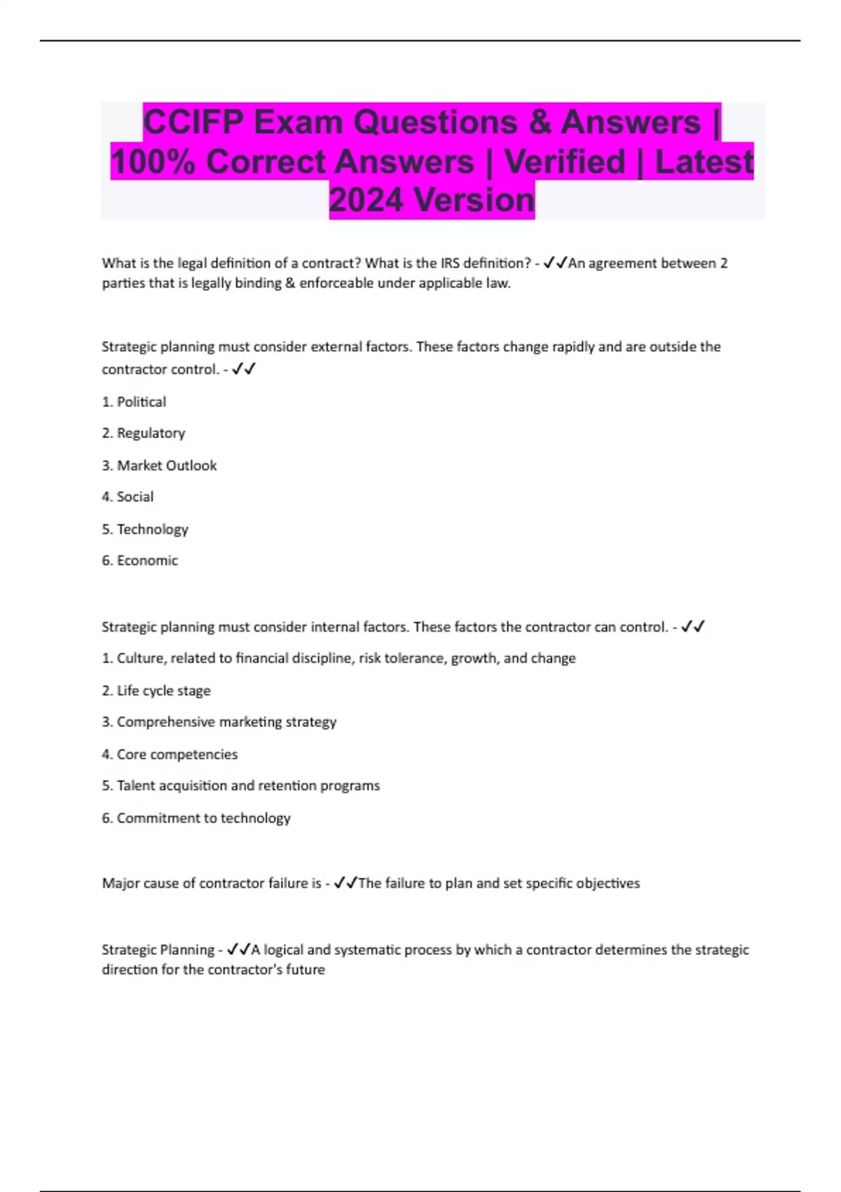CCIFP Exam Questions & Answers | 100% Correct Answers | Verified | Latest 2024 Version What is the legal definition of a contract? What is the IRS definition? - An agreement between 2 parties that is legally binding & enforceable under applicable law. Strategic planning must consider external factors. These factors change rapidly and are outside the contractor control. - 1. Political 2. Regulatory 3. Market Outlook 4. Social 5. Technology 6. Economic Strategic planning must consider internal factors. These factors the contractor can control. - 1. Culture, related to financial discipline, risk tolerance, growth, and change 2. Life cycle stage 3. Comprehensive marketing strategy 4. Core competencies 5. Talent acquisition and retention programs 6. Commitment to technology Major cause of contractor failure is - The failure to plan and set specific objectives Strategic Planning - A logical and systematic process by which a contractor determines the strategic direction for the contractor's future Strategic Planning - Requires knowledge of the risks inherent in the construction industry and of available new business opportunities Strategic Planning Process encourages - 1. Assessment of your company's current condition 2. Examination of current business model and the way you would like to do business in future 3. Development of new future operating methods in estimating, preconstruction, marketing and sales 4. Commitment to set strategic goals and plans to meet them 5. Creation of momentum necessary to start and carry out the implementation of strategic plan What are the 2 coverage triggers for CGL? - 1. Occurrence Trigger - Whatever policy in place a the time of the claim happening is policy used. 2. Claims Trigger - (Not used much) Made trigger policy in place, Policy extended What is the legal definition of a contract? What is the IRS's definition of a contract? - An agreement between two parties that is legally binding & enforceable under applicable law What is RAID? - Redundant array of Independent (or inexpensive) disks. - Data spread out over several disks, users access simultaneously. - Normally used by servers in multi-user environments What is the disclosure on the balance sheet for anticipated losses on contracts? - Estimated liability to complete contracts What is the IRS's definition of a "Home Construction Contract"? - Contracts if 80% of the total contract costs are: 1) Dwelling units, 4 of fewer 2) Improvements directly related to such dwelling units 3) Excluded from IRC 460 - Special rules from long term contracts What is LAN? - Local Area Network What is the difference between cloud computing & virtual environments? - - Cloud computing allows access to data through a browser - Virtual environment allows remote access to data, but access software require on computer to access What is the "look-Back" requirement? - Taxpayer using percentage of completion must redetermined contract profit in year of completion and difference reported in periods are subject to interest charge or refund. What are the 4 types of contracts? - 1) Fixed