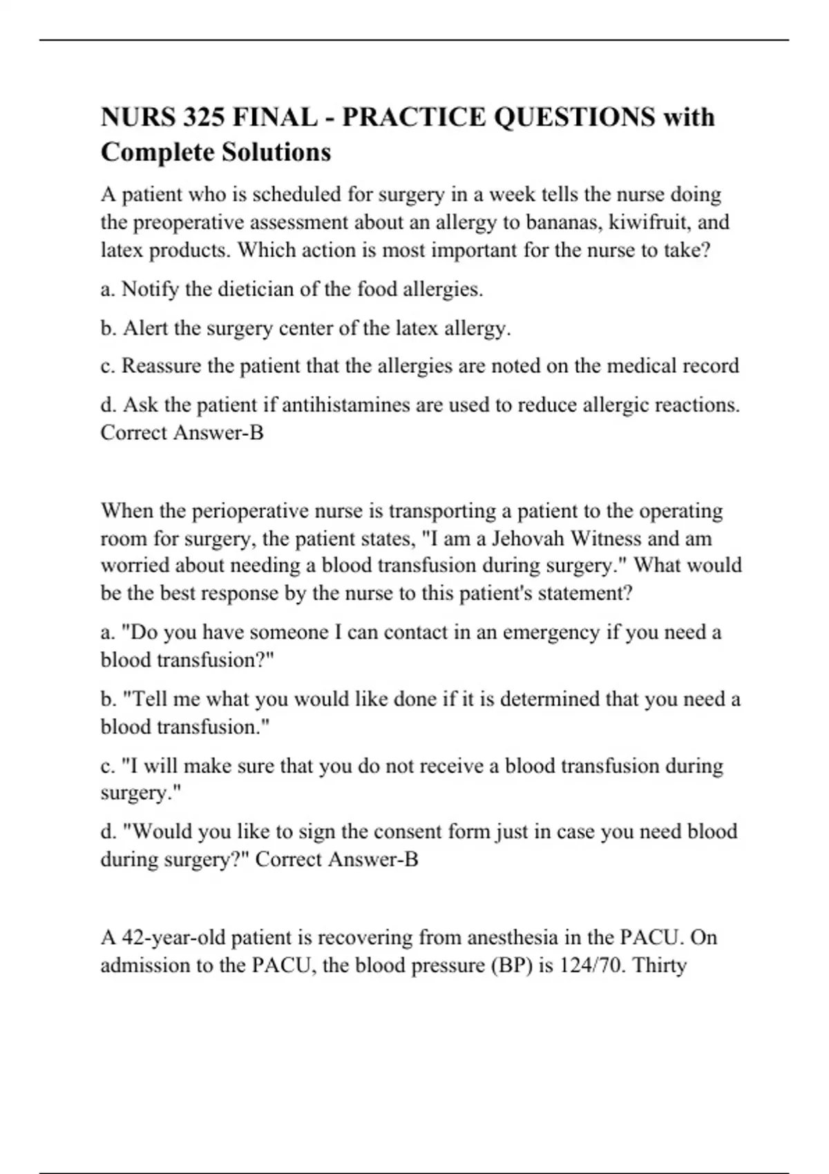 NURS 325 Chamberlain College Of Nursing - NURS 325 FINAL - PRACTICE QUESTIONS with Complete Solutions