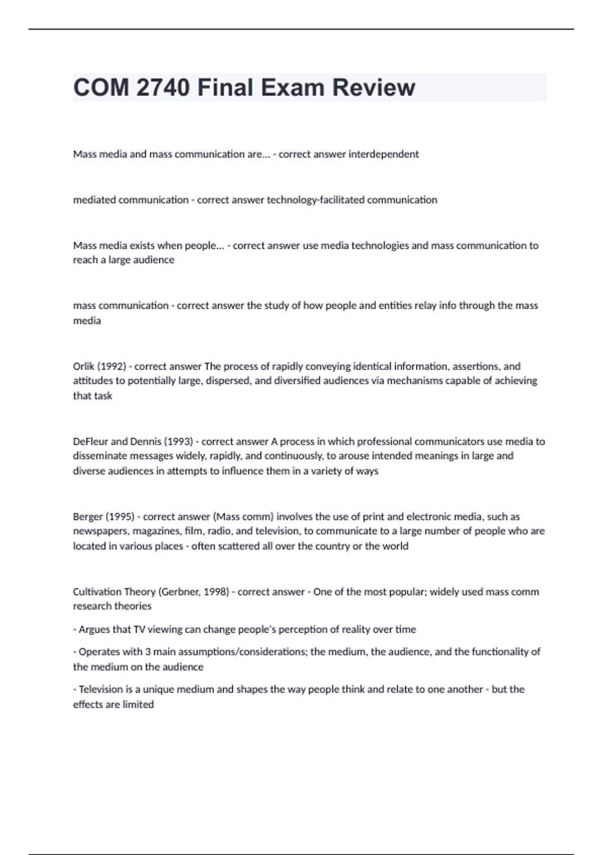COM 2740 Final Exam Review Liberty University Question and answers already passed COM 2740 Final Exam Review Mass media and mass communication are... - correct answer interdependent mediated communication - correct answer technology-facilitated communication Mass media exists when people... - correct answer use media technologies and mass communication to reach a large audience mass communication - correct answer the study of how people and entities relay info through the mass media Orlik (1992) - correct answer The process of rapidly conveying identical information, assertions, and attitudes to potentially large, dispersed, and diversified audiences via mechanisms capable of achieving that task DeFleur and Dennis (1993) - correct answer A process in which professional communicators use media to disseminate messages widely, rapidly, and continuously, to arouse intended meanings in large and diverse audiences in attempts to influence them in a variety of ways