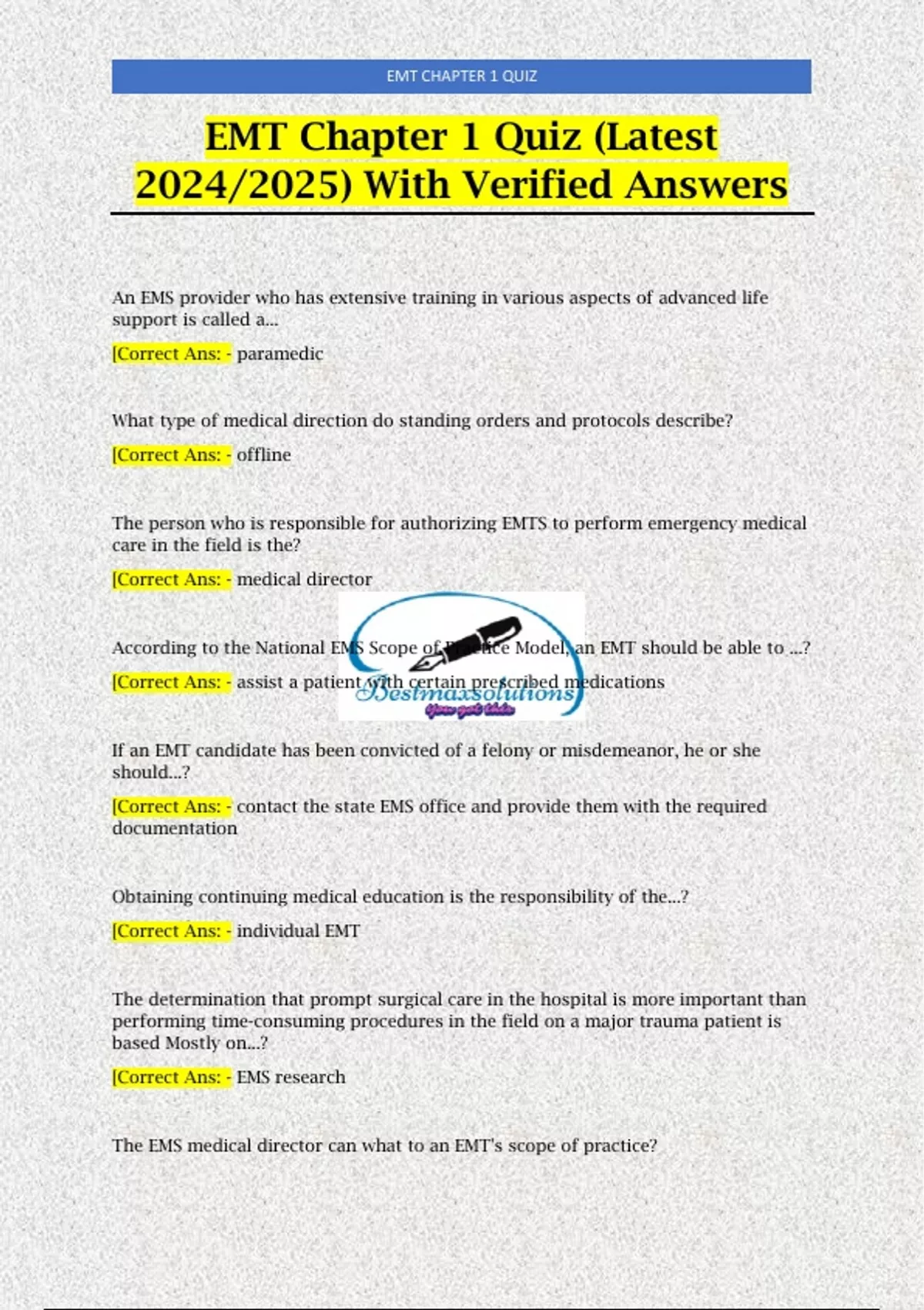 EMT Chapter 1 Quiz (Latest 2024/2025) With Verified Answers,EMT Chapter 1 Quiz (Latest 2024/2025) With Verified Answers
