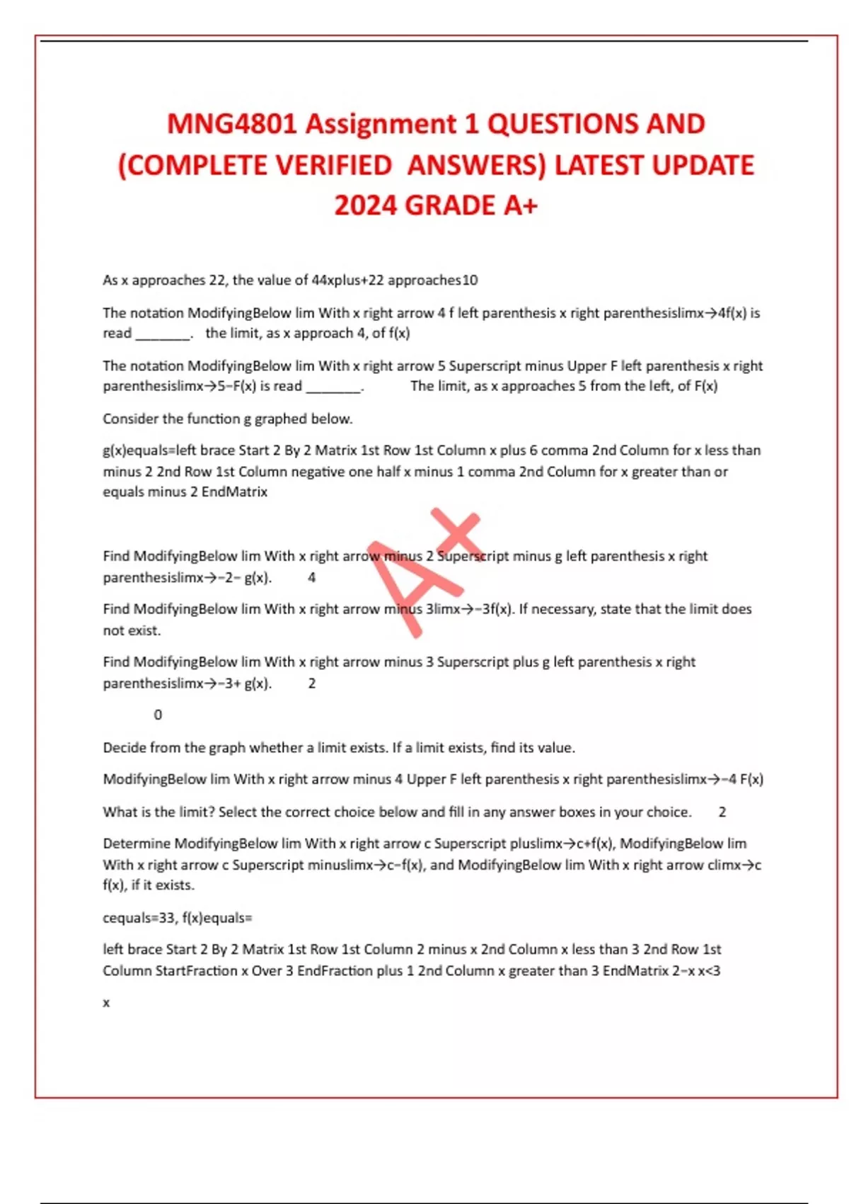 MNG4801 Assignment 1 QUESTIONS AND (COMPLETE VERIFIED ANSWERS) LATEST UPDATE 2024 GRADE A+ As x approaches 22, the value of 44xplus+22 approaches 10 The notation ModifyingBelow lim With x right arrow 4 f left parenthesis x right parenthesislimx→4f(x) is read _______. the limit, as x approach 4, of f(x) The notation ModifyingBelow lim With x right arrow 5 Superscript minus Upper F left parenthesis x right parenthesislimx→5−F(x) is read _______. The limit, as x approaches 5 from the left, of F(x) Consider the function g graphed below. g(x)equals=left brace Start 2 By 2 Matrix 1st Row 1st Column x plus 6 comma 2nd Column for x less than minus 2 2nd Row 1st Column negative one half x minus 1 comma 2nd Column for x greater than or equals minus 2 EndMatrix Find ModifyingBelow lim With x right arrow minus 2 Superscript minus g left parenthesis x right parenthesislimx→−2− g(x). 4 Find ModifyingBelow lim With x right arrow minus 3limx→−3f(x). If necessary, state that the limit does not exist. Find ModifyingBelow lim With x right arrow minus 3 Superscript plus g left parenthesis x right parenthesislimx→−3+ g(x). 2 0 Decide from the graph whether a limit exists. If a limit exists, find its value. ModifyingBelow lim With x right arrow minus 4 Upper F left parenthesis x right parenthesislimx→−4 F(x) What is the limit? Select the correct choice below and fill in any answer boxes in your choice. 2 Determine ModifyingBelow lim With x right arrow c Superscript pluslimx→c+f(x), ModifyingBelow lim With x right arrow c Superscript minuslimx→c−f(x), and ModifyingBelow lim With x right arrow climx→cf(x), if it exists. cequals=33, f(x)equals= left brace Start 2 By 2 Matrix 1st Row 1st Column 2 minus x 2nd Column x less than 3 2nd Row 1st Column StartFraction x Over 3 EndFraction plus 1 2nd Column x greater than 3 EndMatrix 2−x x<3 x 3+1 x>3 The cost of sending a large envelope via first-class mail is $0.710.71 for the first ounce and $0.120.12 for each additional ounce (or fraction thereof). If x represents the weight of a large envelope, in ounces, then p(x) is the cost of mailing it, where p(x)equals=$0.710.71 if 0less than<xless than or equals≤1, p(x)equals=$0.830.83 if 1less than<xless than or equals≤2, and so on, up through 13 ounces. The graph of p is shown to the right. Use the graph to find each