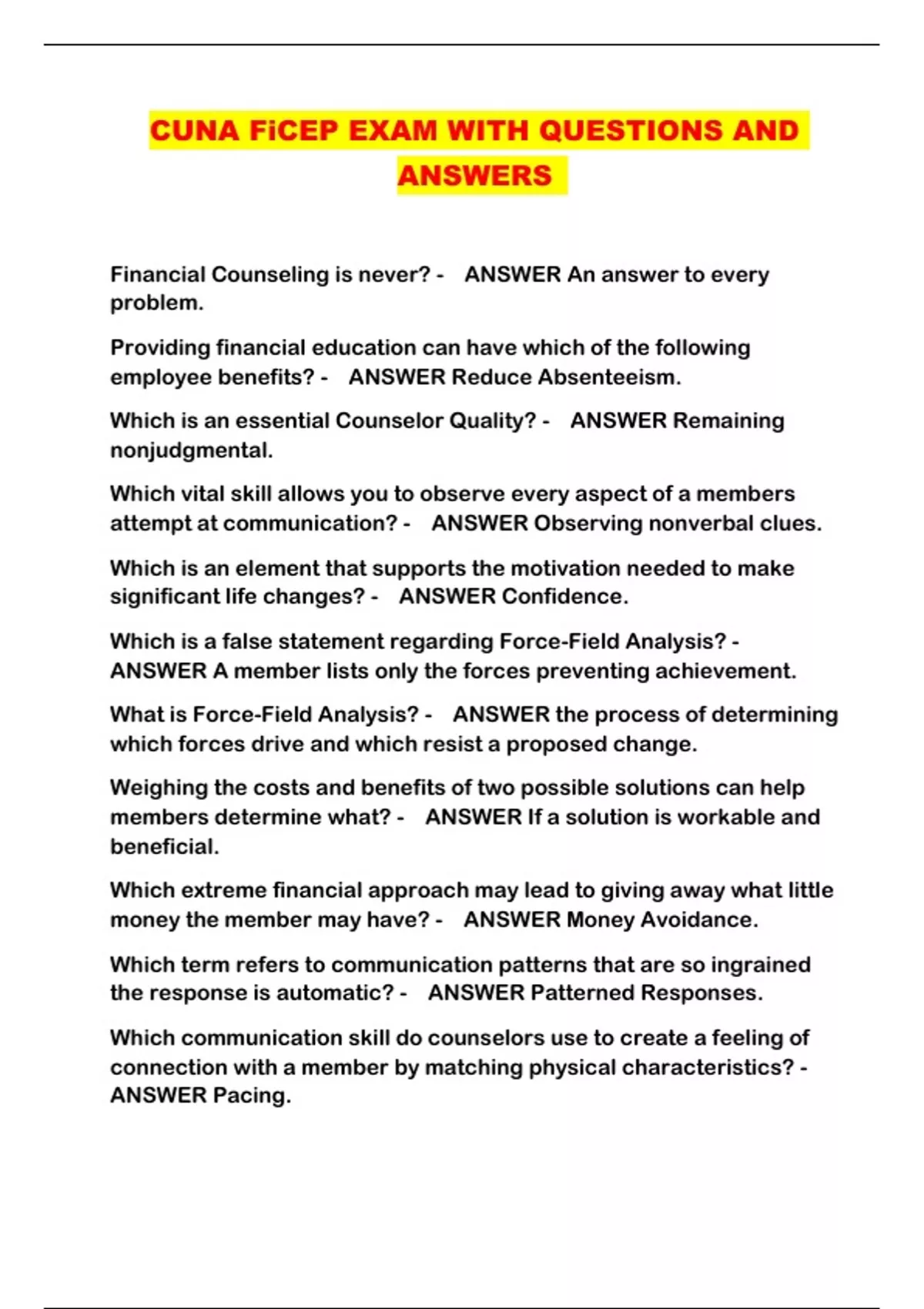 CUNA FiCEP EXAM WITH QUESTIONS AND ANSWERS ...