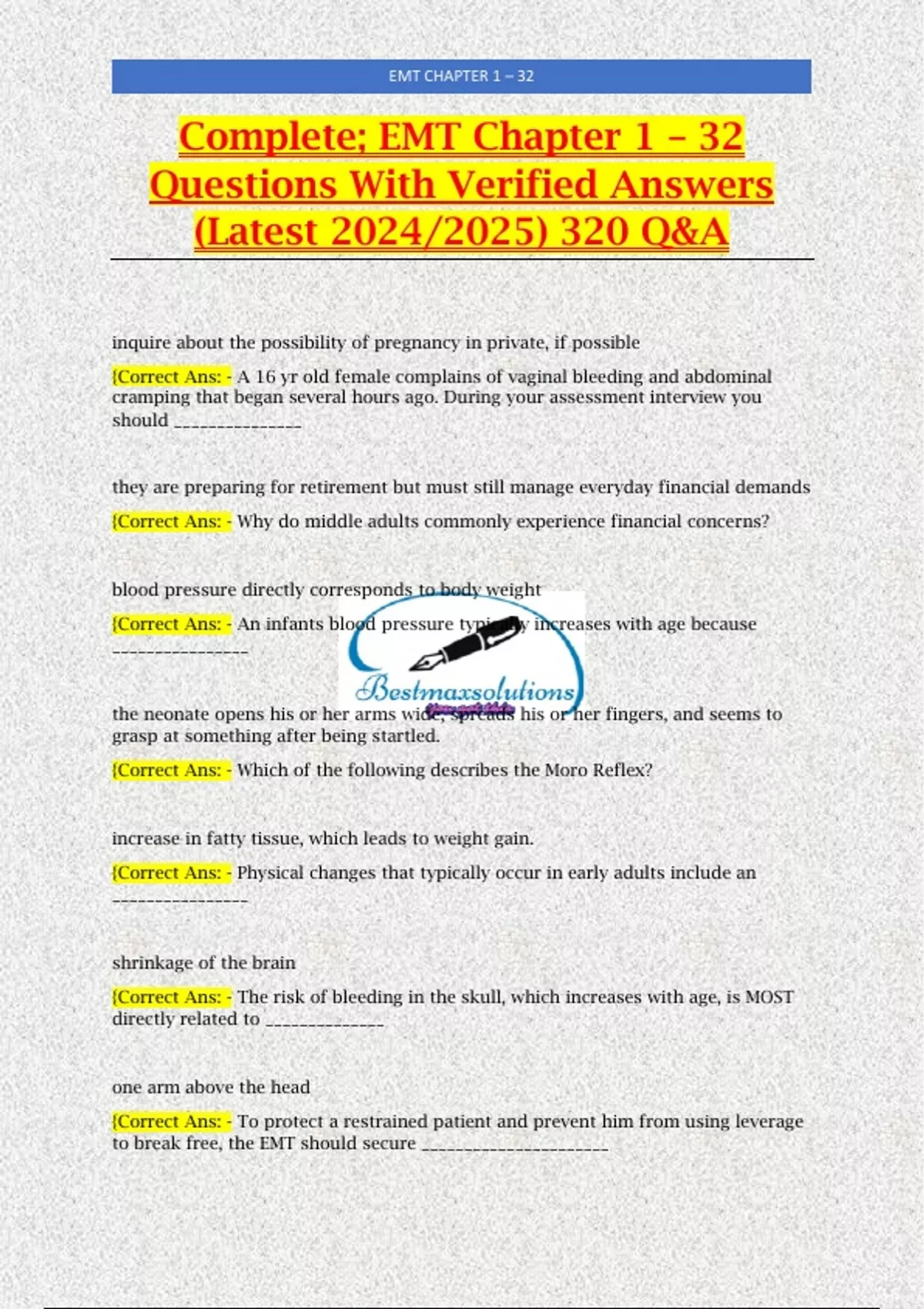 Complete; EMT Chapter 1 – 32 Questions With Verified Answers (Latest 2024/2025) 320 Q&A