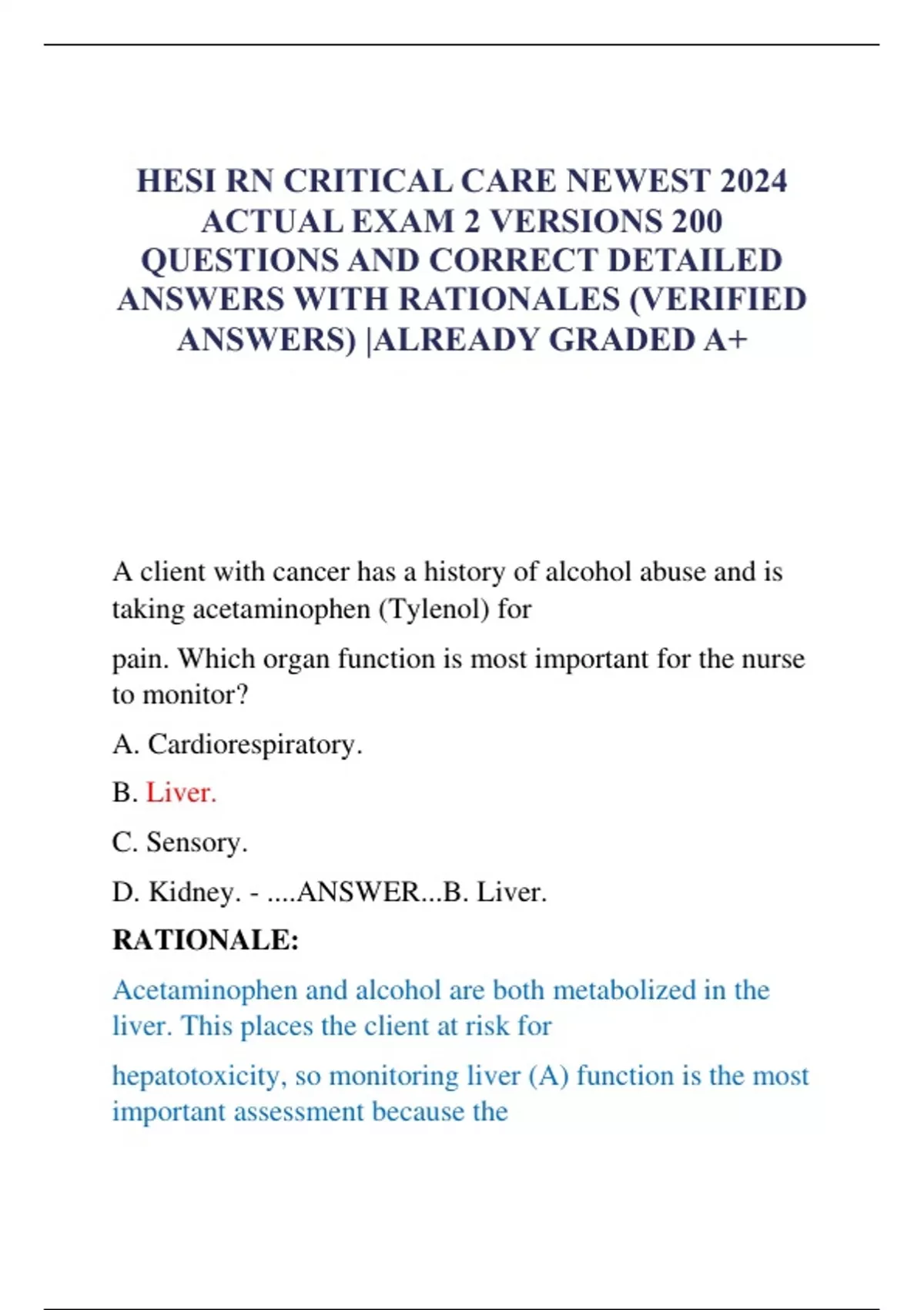 HESI RN CRITICAL CARE NEWEST 2024 ACTUAL EXAM 2 VERSIONS 200 QUESTIONS AND CORRECT DETAILED ANSWERS WITH RATIONALES (VERIFIED ANSWERS) |ALREADY GRADED A+