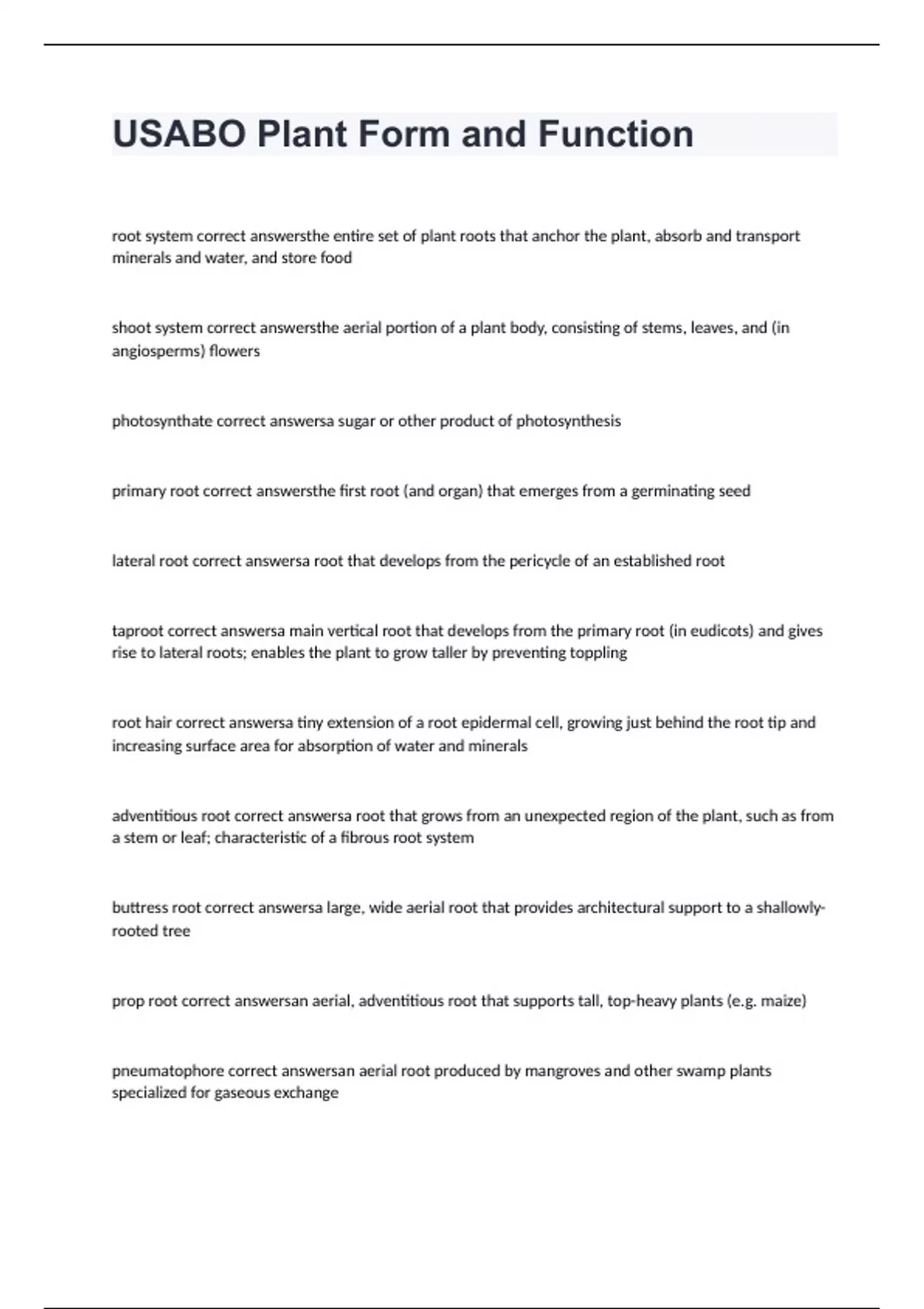 root system correct answersthe entire set of plant roots that anchor the plant, absorb and transport minerals and water, and store food shoot system correct answersthe aerial portion of a plant body, consisting of stems, leaves, and (in angiosperms) flowers photosynthate correct answersa sugar or other product of photosynthesis primary root correct answersthe first root (and organ) that emerges from a germinating seed lateral root correct answersa root that develops from the pericycle of an established root taproot correct answersa main vertical root that develops from the primary root (in eudicots) and gives rise to lateral roots; enables the plant to grow taller by preventing toppling root hair correct answersa tiny extension of a root epidermal cell, growing just behind the root tip and increasing surface area for absorption of water and minerals adventitious root correct answersa root that grows from an unexpected region of the plant, such as from a stem or leaf; characteristic of a fibrous root system buttress root correct answersa large, wide aerial root that provides architectural support to a shallowly-rooted tree prop root correct answersan aerial, adventitious root that supports tall, top-heavy plants (e.g. maize) pneumatophore correct answersan aerial root produced by mangroves and other swamp plants specialized for gaseous exchange