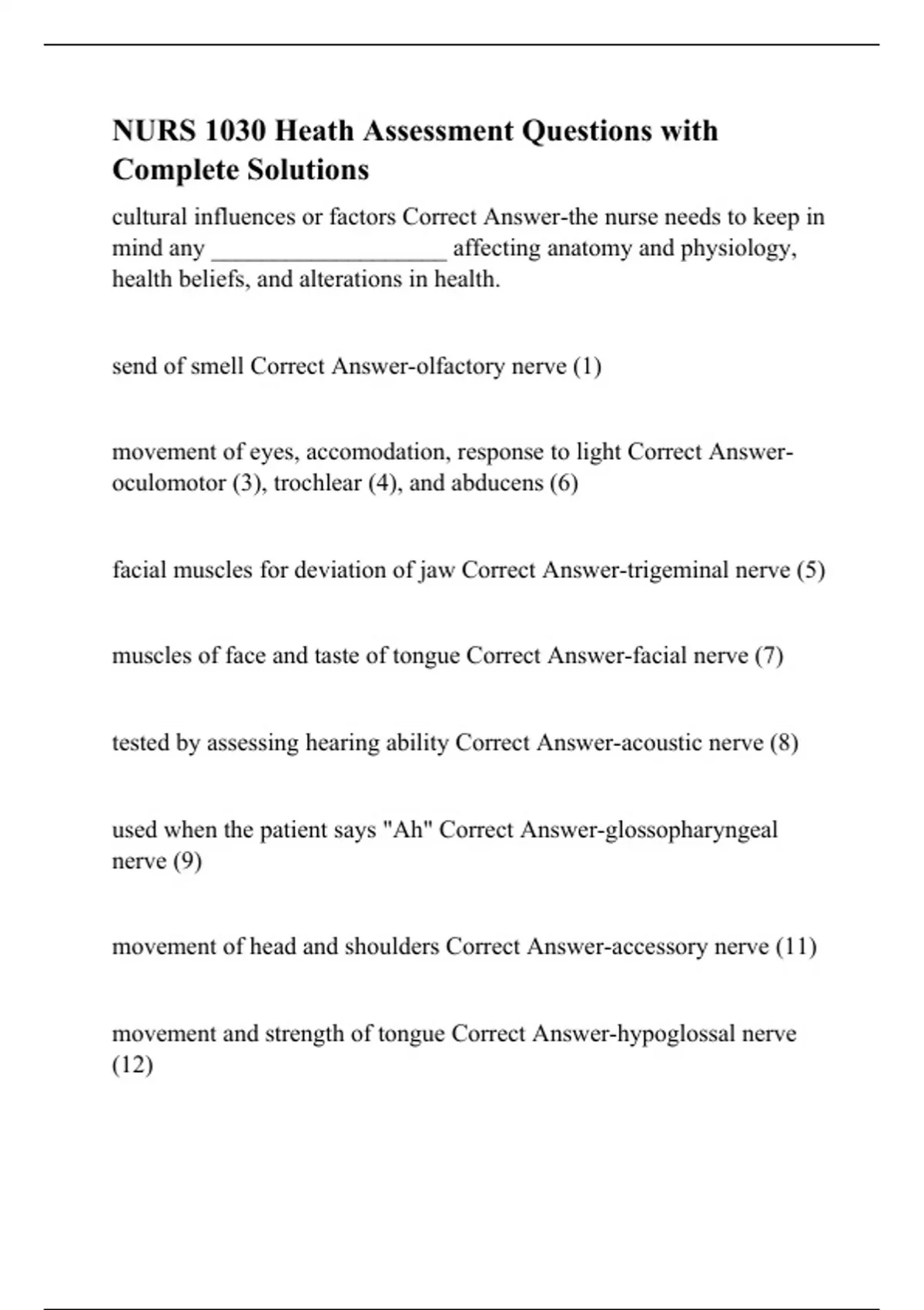 NURS 1030 Heath Assessment Questions with Complete Solutions
