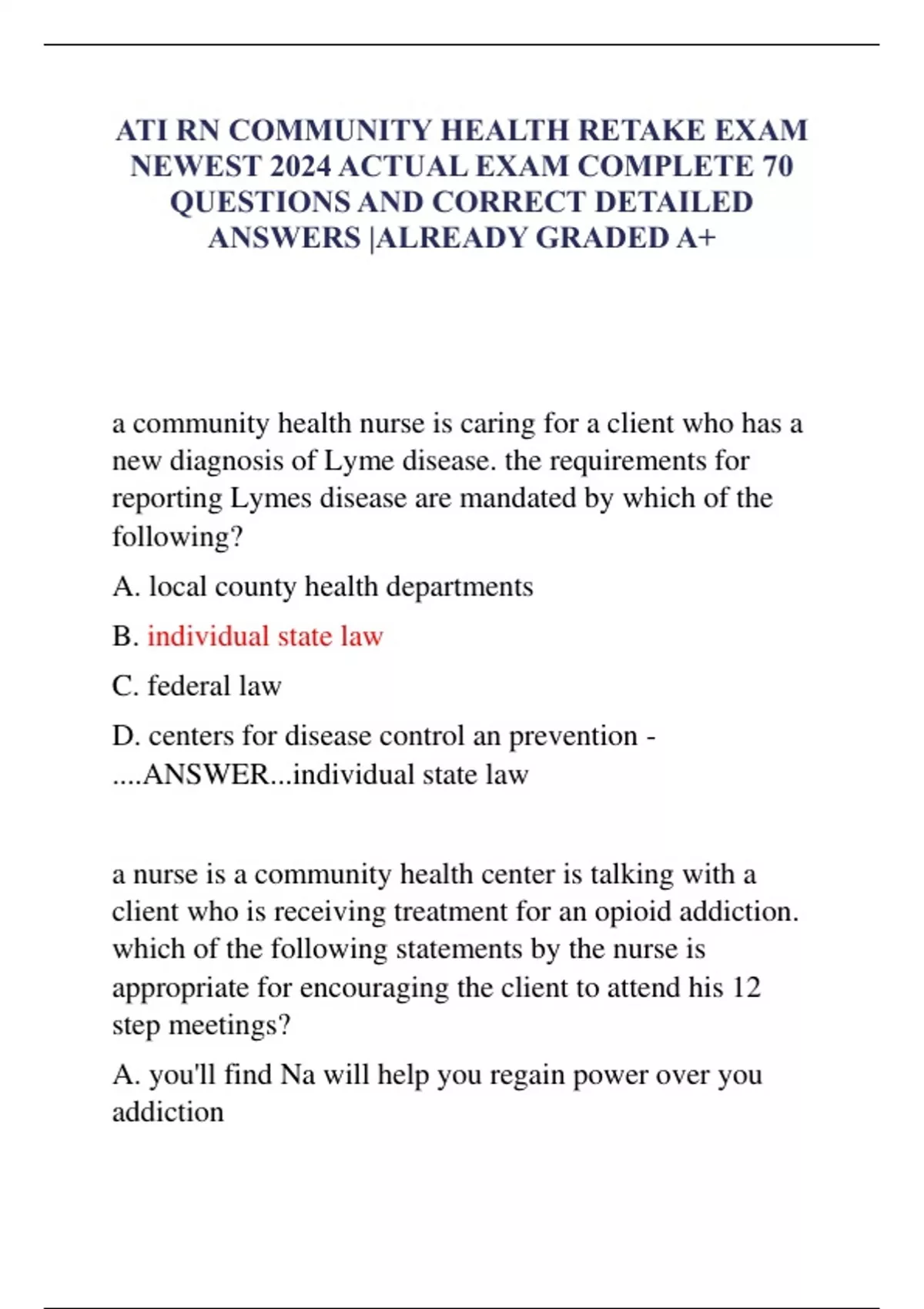 ATI RN COMMUNITY HEALTH RETAKE EXAM NEWEST 2024 ACTUAL EXAM COMPLETE 70 QUESTIONS AND CORRECT DETAILED ANSWERS |ALREADY GRADED A+