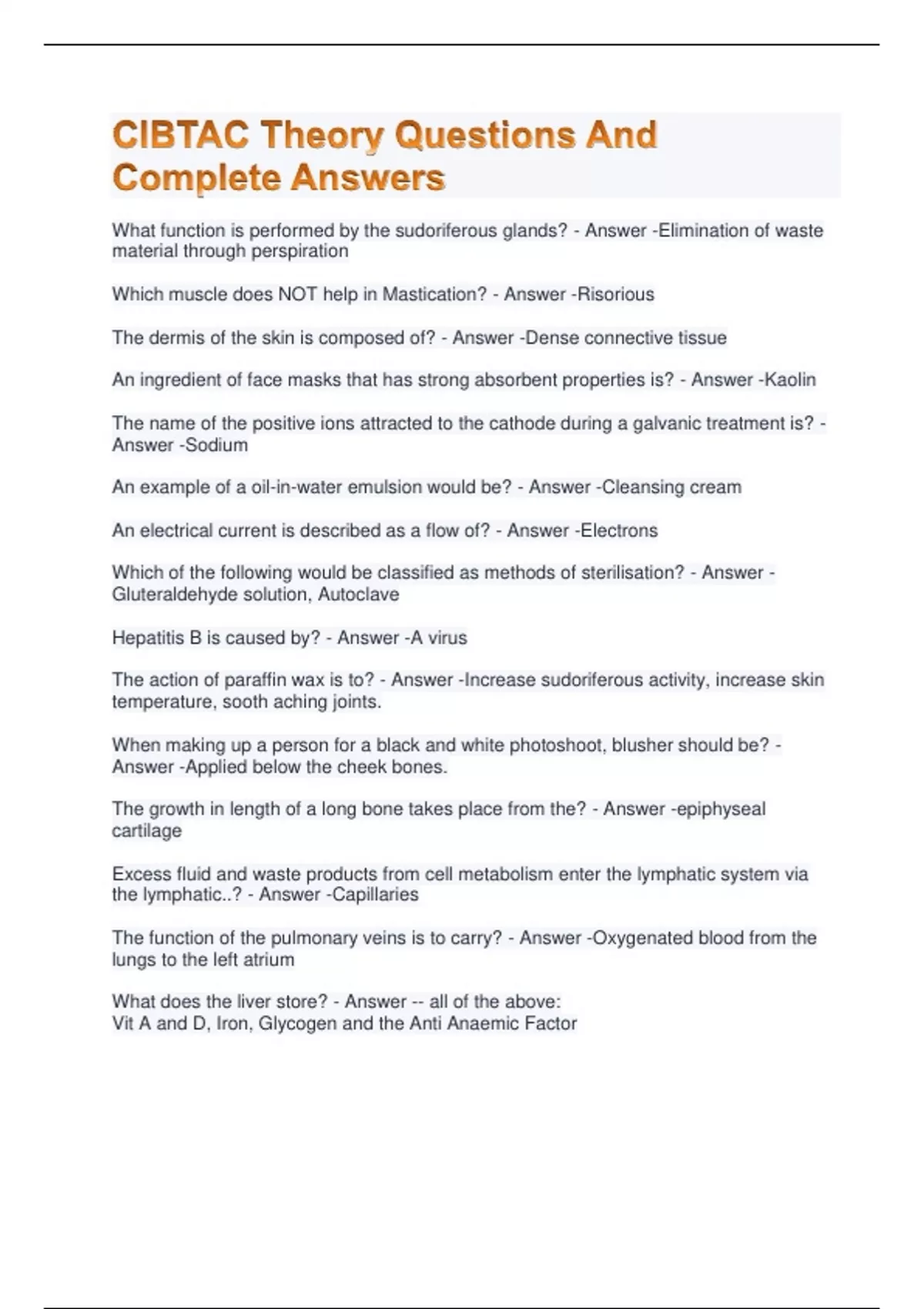 CIBTAC Theory Questions And Complete Answers What function is performed by the sudoriferous glands? - Answer -Elimination of waste material through perspiration Which muscle does NOT help in Mastication? - Answer -Risorious The dermis of the skin is composed of? - Answer -Dense connective tissue An ingredient of face masks that has strong absorbent properties is? - Answer -Kaolin The name of the positive ions attracted to the cathode during a galvanic treatment is? - Answer -Sodium An example of a oil-in-water emulsion would be? - Answer -Cleansing cream An electrical current is described as a flow of? - Answer -Electrons Which of the following would be classified as methods of sterilisation? - Answer -Gluteraldehyde solution, Autoclave Hepatitis B is caused by? - Answer -A virus The action of paraffin wax is to? - Answer -Increase sudoriferous activity, increase skin temperature, sooth aching joints. When making up a person for a black and white photoshoot, blusher should be? - Answer -Applied below the cheek bones. The growth in length of a long bone takes place from the? - Answer -epiphyseal cartilage Excess fluid and waste products from cell metabolism enter the lymphatic system via the lymphatic..? - Answer -Capillaries The function of the pulmonary veins is to carry? - Answer -Oxygenated blood from the lungs to the left atrium What does the liver store? - Answer -- all of the above: Vit A and D, Iron, Glycogen and the Anti Anaemic Factor Which of the following statement correctly describes the process of internal respiration? - Answer -Oxygen diffuses out of the blood into the tissues and carbon dioxide diffuses from the tissues into the blood.