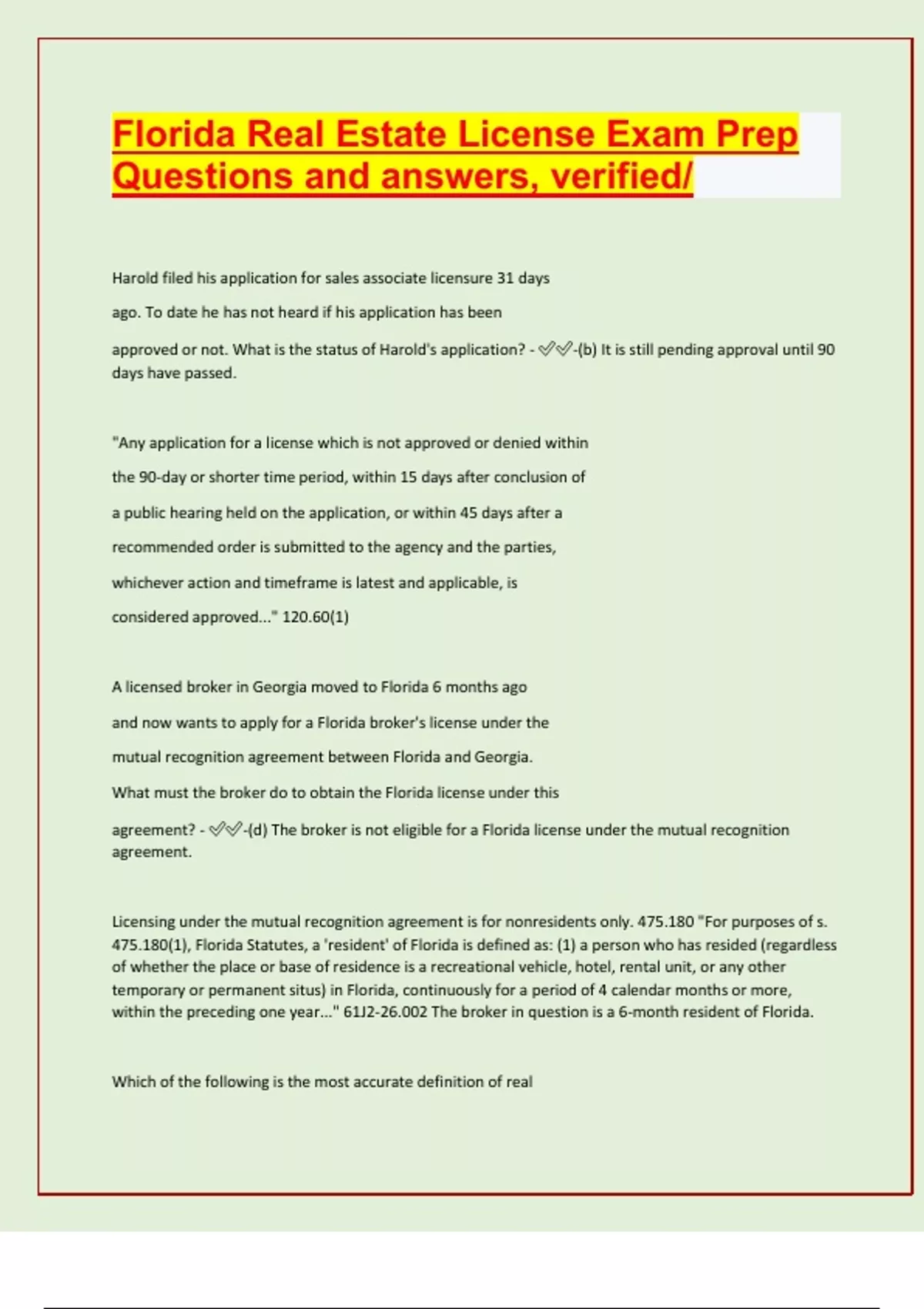 Florida Real Estate License Exam Prep Questions and answers, verified/ Harold filed his application for sales associate licensure 31 days ago. To date he has not heard if his application has been approved or not. What is the status of Harold's application? - -(b) It is still pending approval until 90 days have passed. "Any application for a license which is not approved or denied within the 90-day or shorter time period, within 15 days after conclusion of a public hearing held on the application, or within 45 days after a recommended order is submitted to the agency and the parties, whichever action and timeframe is latest and applicable, is considered approved..." 120.60(1) A licensed broker in Georgia moved to Florida 6 months ago and now wants to apply for a Florida broker's license under the mutual recognition agreement between Florida and Georgia. What must the broker do to obtain the Florida license under this agreement? - -(d) The broker is not eligible for a Florida license under the mutual recognition agreement. Licensing under the mutual recognition agreement is for nonresidents only. 475.180 "For purposes of s. 475.180(1), Florida Statutes, a 'resident' of Florida is defined as: (1) a person who has resided (regardless of whether the place or base of residence is a recreational vehicle, hotel, rental unit, or any other temporary or permanent situs) in Florida, continuously for a period of 4 calendar months or more, within the preceding one year..." 61J2-26.002 The broker in question is a 6-month resident of Florida. Which of the following is the most accurate definition of real estate broker? - -(c) A person who buys or sells real estate on behalf of others for compensation "Broker means a person who, for another, and for a compensation or valuable consideration directly or indirectly paid or promised, expressly or impliedly, or with an intent to collect or receive a compensation or valuable consideration therefor, appraises, auctions, sells, exchanges, buys, rents, or offers, attempts or agrees to appraise, auction, or negotiate the sale, exchange, purchase, or rental of business enterprises or business opportunities or any real property or any interest in or concerning the same..." 475.01(1)(a) Which Florida statute establishes real estate licensees' legal rights and responsibilities? - -(b) Chapter 475 "Purpose.—The Legislature deems it necessary in the interest of the public welfare to regulate real estate brokers, sales associates, and schools in this state." 475.001 What is the best definition for "real estate"? - -(b) Interest in land, business enterprises, or business opportunities with some exceptions "'Real property' or 'real estate' means any interest or estate in land and any interest in business enterprises or business opportunities, including any assignment, leasehold, subleasehold, or mineral right; however, the term does not include any cemetery lot or right of burial in any cemetery; nor does the term include the renting of a mobile home lot or recreational vehicle lot in a mobile home park or travel park." 475.01(1)(i) Which of the following is a requirement of the general licensing provisions? - -(d) Social Security number "Any person desiring to be licensed shall apply to the department in writing. The application for licensure shall be submitted on a form prescribed by the department and must include the applicant's social security number." 455.213(1) Florida sales associate educational requirements include? - -(c) 14 hours of continuing education every 2 years "The renewal application for an active license as broker, broker associate, or sales associate shall include proof satisfactory to the commission that the licensee has, since the issuance or renewal of her or his current license, satisfactorily completed at least 14 classroom hours of 50 minutes each of a continuing education course during each biennium of a license period, as prescribed by the commission." 475.182(1)(a) Florida broker pre-license requirements include? - -(d) 72 hours of pre-licensing coursework. "The course or courses required for one to become initially licensed shall not exceed a total of 63 classroom hours of 50 minutes each, inclusive of examination, for a sales associate and 72 classroom hours of 50 minutes each, inclusive of examination, for a broker." 475.17(2)(a)1. Which of the following real estate services can legally be offered by someone not licensed as a real estate broker, broker associate, or sales associate? - -(d) An individual re
