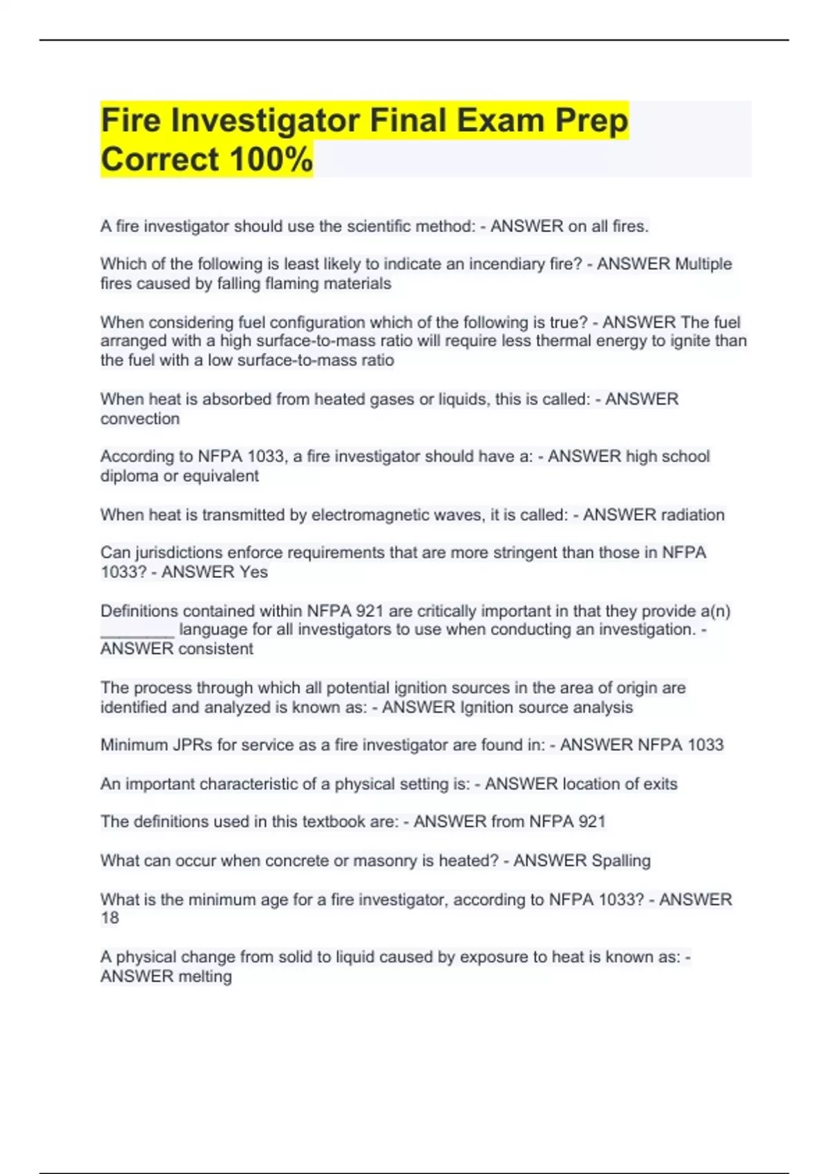 A fire investigator should use the scientific method: - ANSWER on all fires. Which of the following is least likely to indicate an incendiary fire? - ANSWER Multiple fires caused by falling flaming materials When considering fuel configuration which of the following is true? - ANSWER The fuel arranged with a high surface-to-mass ratio will require less thermal energy to ignite than the fuel with a low surface-to-mass ratio When heat is absorbed from heated gases or liquids, this is called: - ANSWER convection According to NFPA 1033, a fire investigator should have a: - ANSWER high school diploma or equivalent When heat is transmitted by electromagnetic waves, it is called: - ANSWER radiation Can jurisdictions enforce requirements that are more stringent than those in NFPA 1033? - ANSWER Yes Definitions contained within NFPA 921 are critically