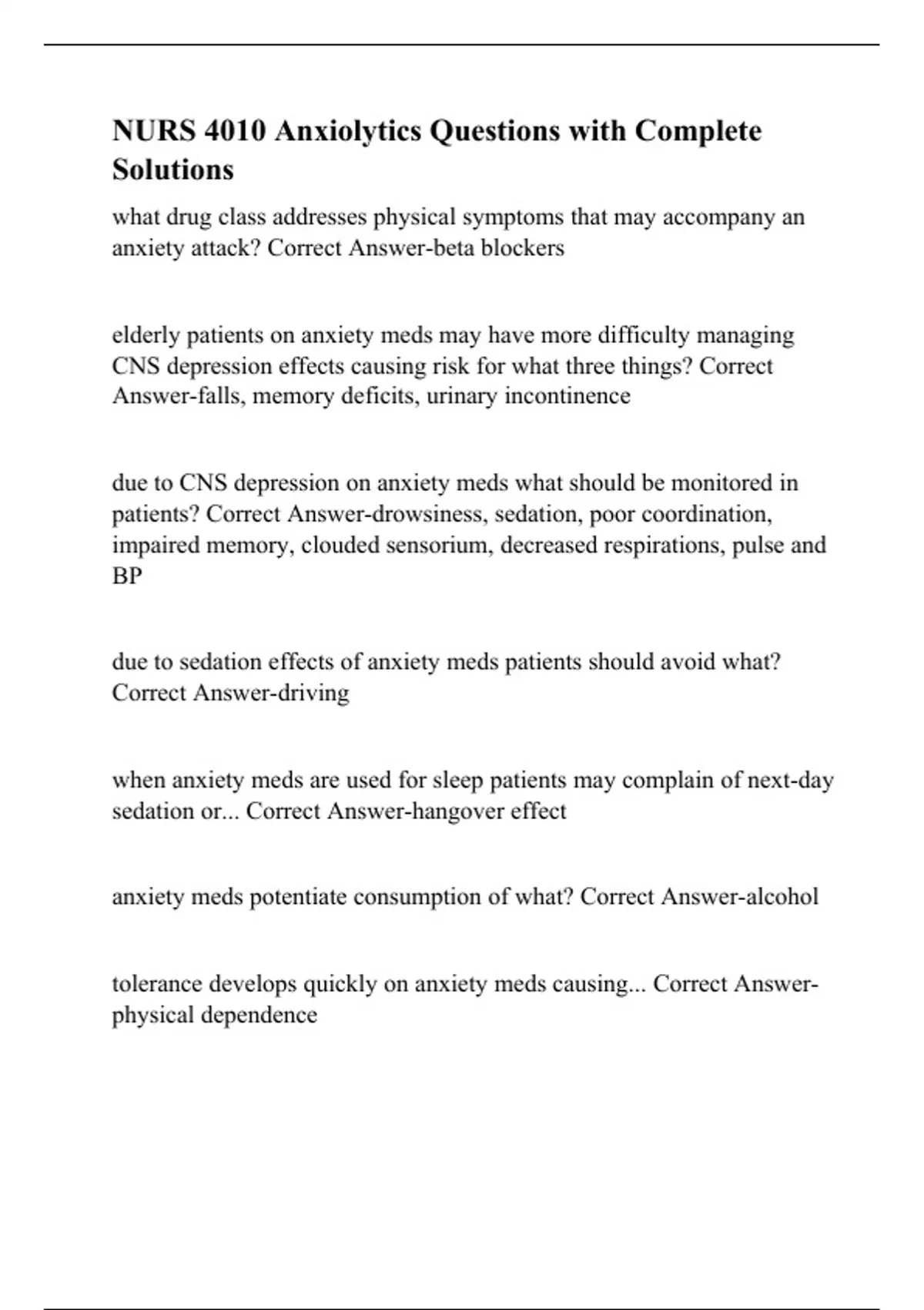 NURS 4010 Anxiolytics Questions with Complete Solutions