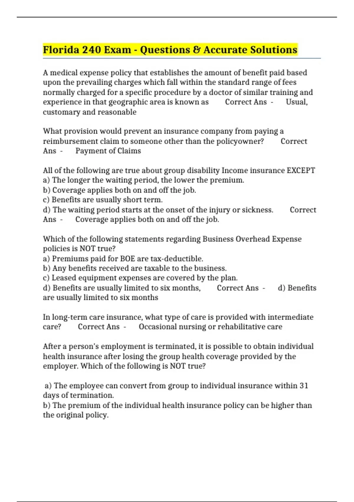 florida 240 exam questions accurate solutions