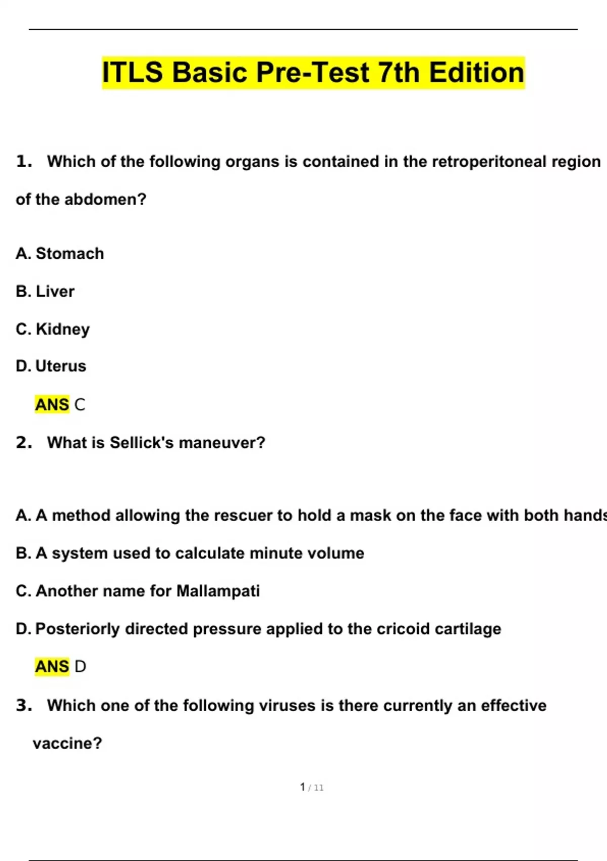 ITLS Basic Pre-Test 7th Edition 2024 Questions with 100% Correct Answers | Updated & Verified
